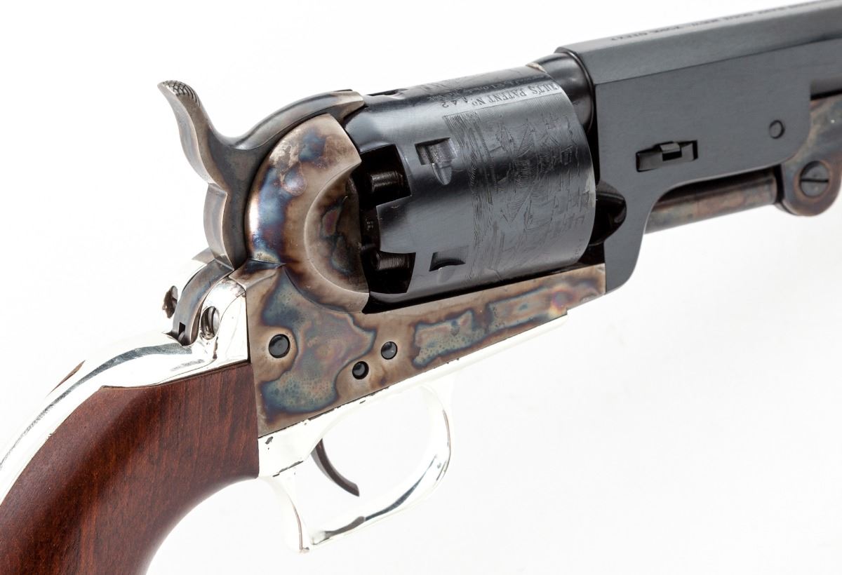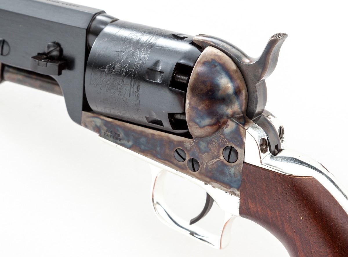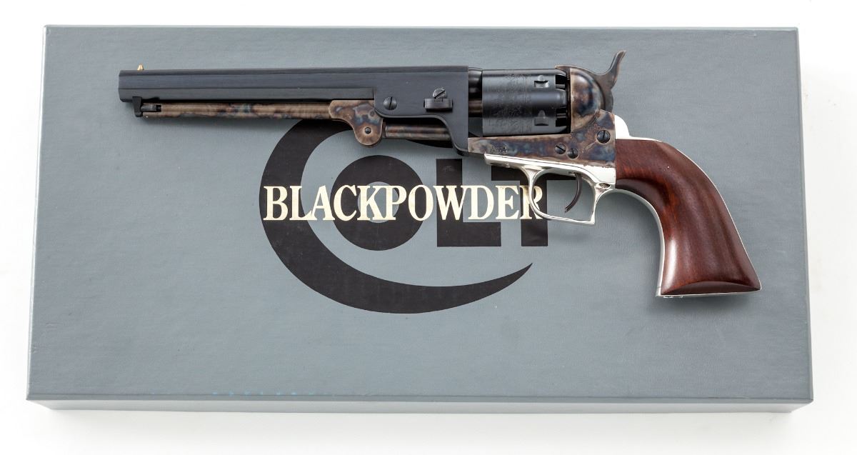 Colt Black Powder Signature Series 1851 Navy Percussion Revolver, #32142, .36 cal., 7-1/2'' barrel, blue and case hardened finish, silver-plated backstrap and triggerguard, smooth hardwood grips. Condition is excellent, appearing as new and unfired. Triggerguard shows light tarnishing along top edge. In original gray box with paperwork. Est.: $450-$650.