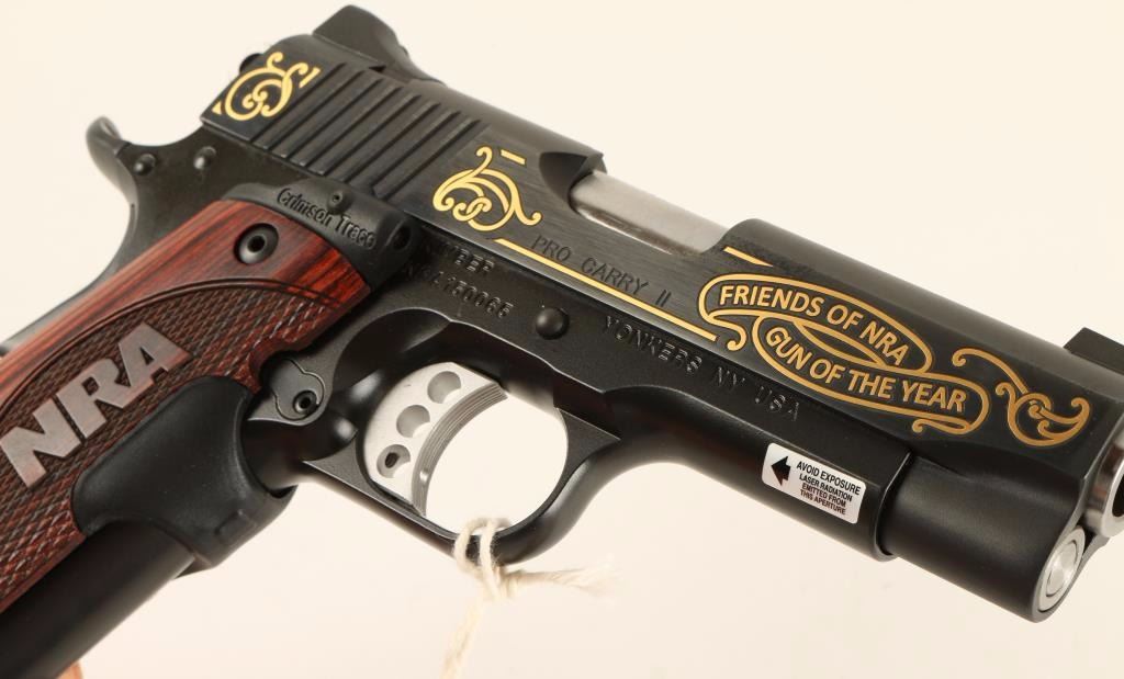 'Friends of NRA Gun of The Year' Commemorative single action semi automatic pistol chambered in .45 Automatic Colt Pistol. Features a blued finish, 4" stainless steel bull barrel, low profile sights, floral etched & gold embellished slide, coated aluminum frame, skeletonized hammer, serrated trigger, 7 round magazine, thumb safety switch, beavertail grip safety, checkered main spring housing, and laser cut NRA Crimson Trace wood grips. Includes original factory hard case with documents. Finish shows no signs of wear. Action is smooth, bore is excellent, and wood grips are fine. Condition is like new in box. ***Modern Firearm***