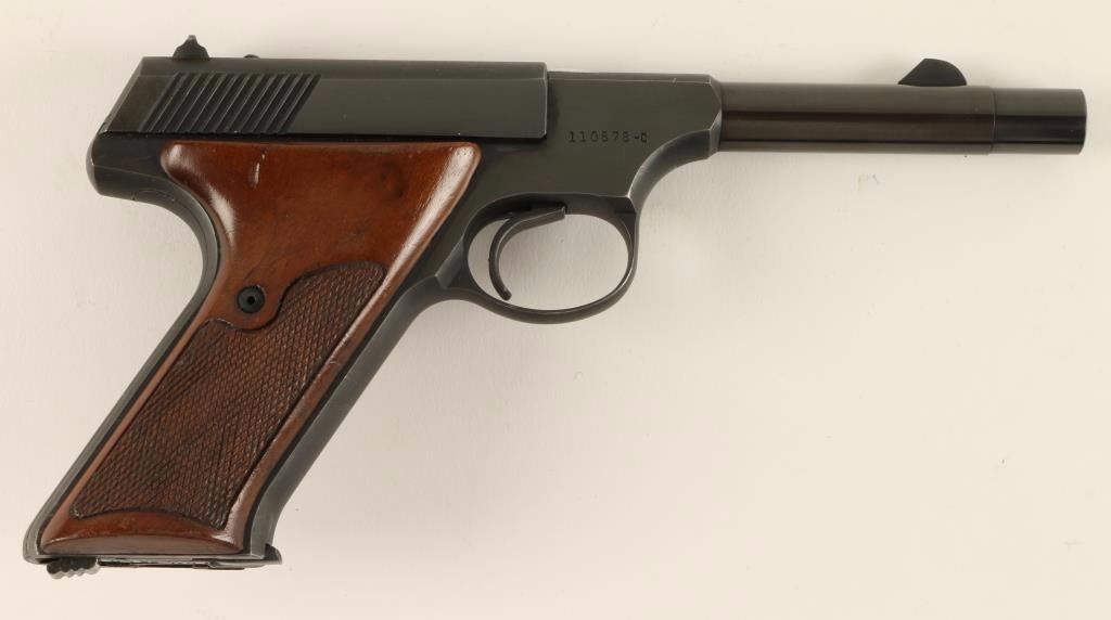 Single action semi automatic target pistol chambered in .22 Long Rifle, circa 1960's - 1970's. Features a blued finish, 4.5" threaded barrel with thread protector, blade front sight, adjustable rear sight, serrated slide, smooth wide trigger, thumb safety switch, 10 round magazine, and two piece checkered walnut target grips. Includes a wood grain cardboard box. Pistol retains 94% original finish on frame & slide with refinished barrel turning plum. Action is smooth, bore is excellent, and wood grips are very good. Condition is very good. ***Modern Firearm***