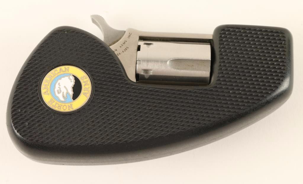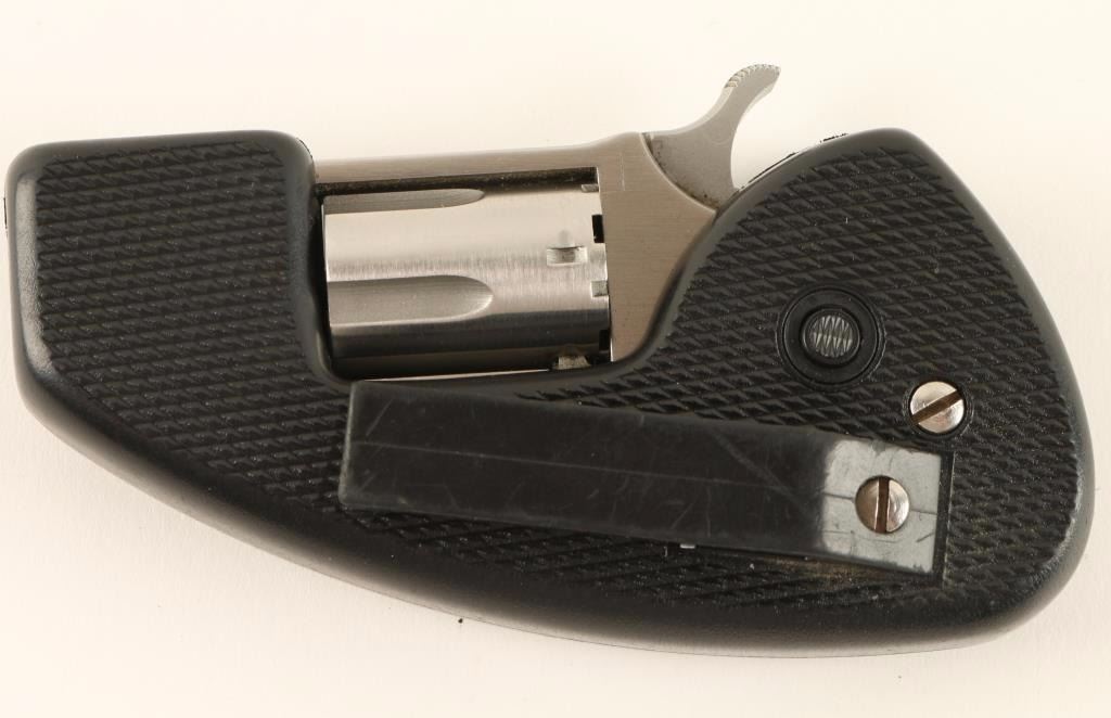 Extra small stainless steel single action revolver chambered in .22 Long Rifle. Features a brushed finish, 1 1/8" barrel, blade front sight, fluted five shot cylinder with notched safety rests, serrated spur trigger & hammer spur, and folding black checkered grips with pocket clip. Includes a factory soft case. Revolver's brushed finish is worn bright in a few areas where it rubs on it's fold-up grips. Action is smooth, bore is excellent, and grips are fine. Condition is very good. ***Modern Firearm***