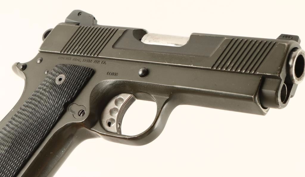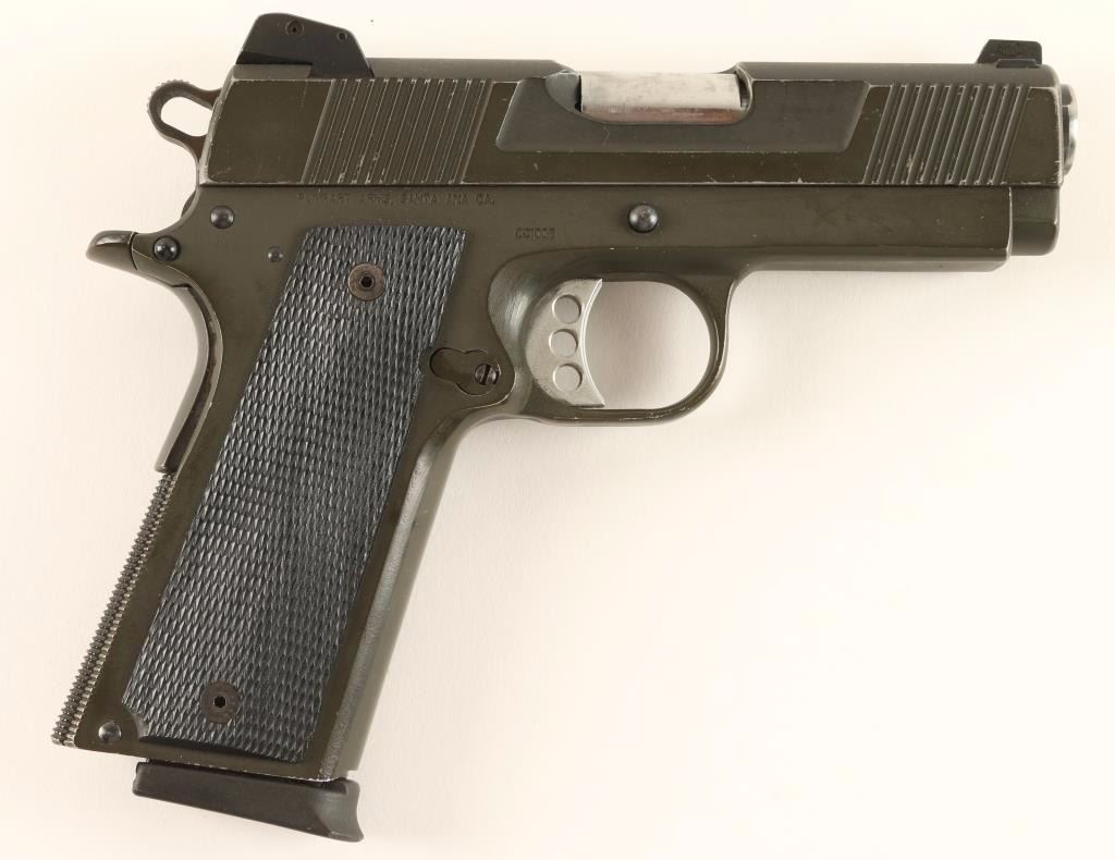 Custom semi automatic 1911 style pistol chambered in .45 Automatic Colt Pistol, by Santa Ana, California maker. Features on olive drab finish, semi-heavy 3.5" stainless steel barrel, slide serrated in front & rear, MMC three dot adjustable sights, skeletonized hammer, adjustable serrated trigger, checkered mainspring housing, thumb safety switch, beavertail grip safety, push button magazine release, 8 round magazine, and two piece black checked plastic grips. Pistol shows edge wear on slide & frame with some other losses and overall 90% finish intact. Action is tight, bore is pristine, and grips are fine. Condition is very good. ***Modern Firearm***