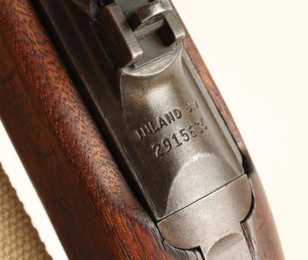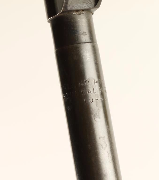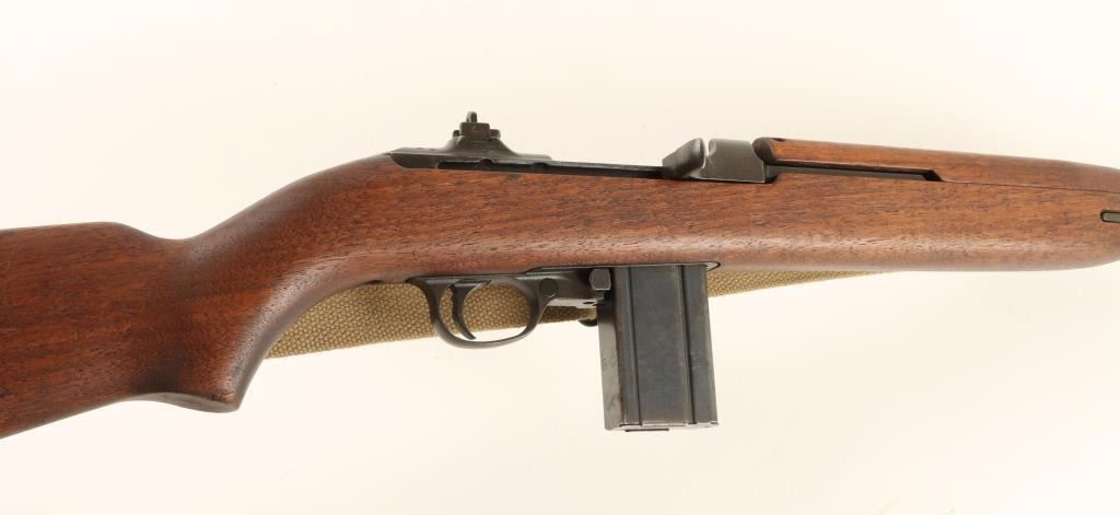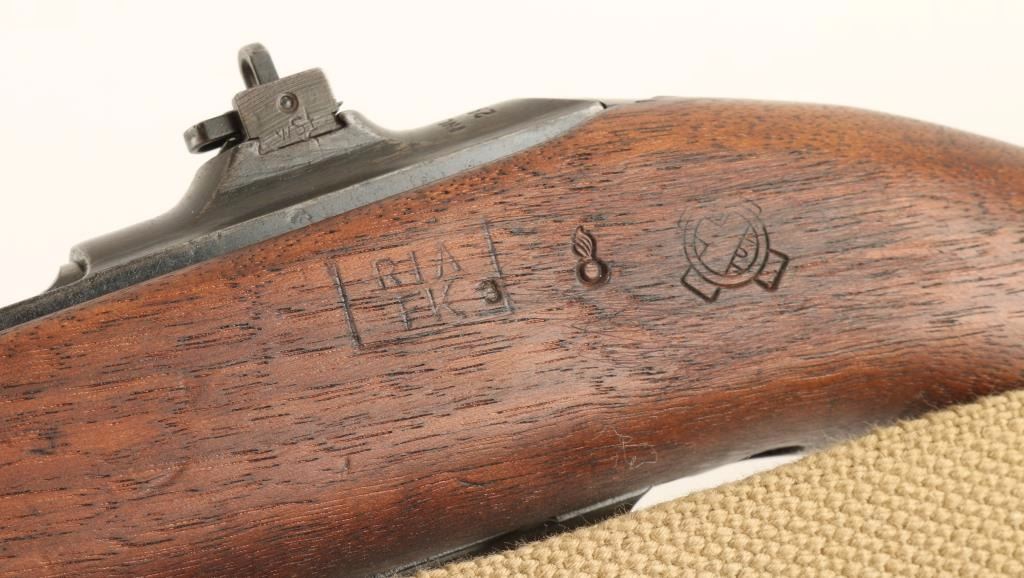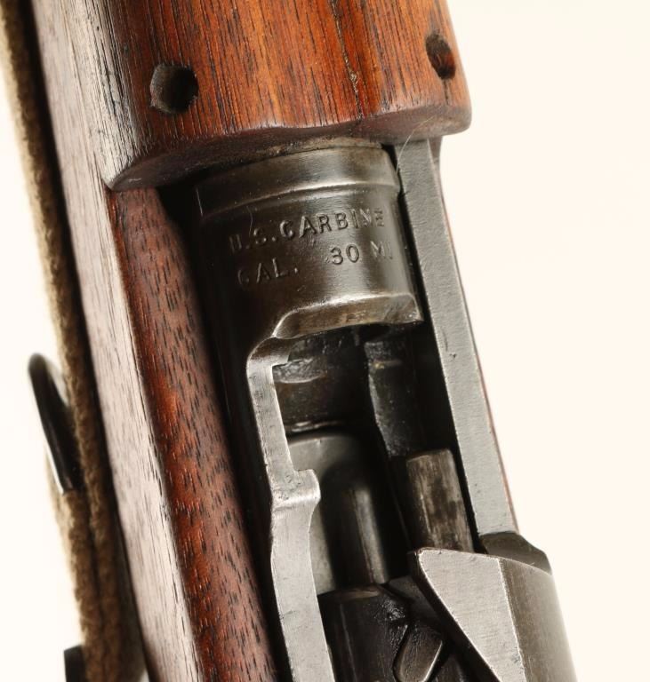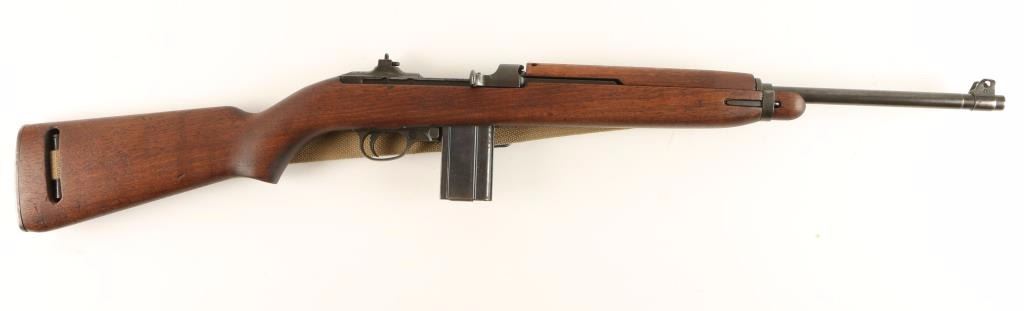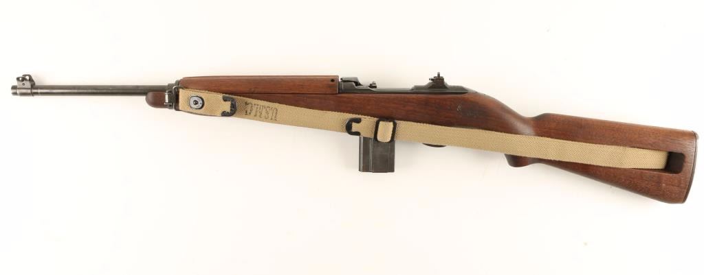 U.S. Military contracted semi-automatic rifle chambered in .30 Carbine, circa 1943. Features a blued finish, 18" Inland barrel dated 10-43, winged front sight, flip-up dual aperture rear sight, thin barrel band, period tan canvas sling, low-wood handguard with narrow groove, oval cut oiler slot, push button safety, 15 round magazine, smooth trigger, flat bolt, and wood shoulder stock with circled "P", Crosses Cannons, Flaming Bomb, & "RIA/FK" cartouche. Rifle retains 70% blued finish with moderate even wear. Action is smooth, bore is excellent, and wood stocks are near fine with few dings. Condition is excellent as vintage. ***C&R Firearm*** ***Modern Firearm***