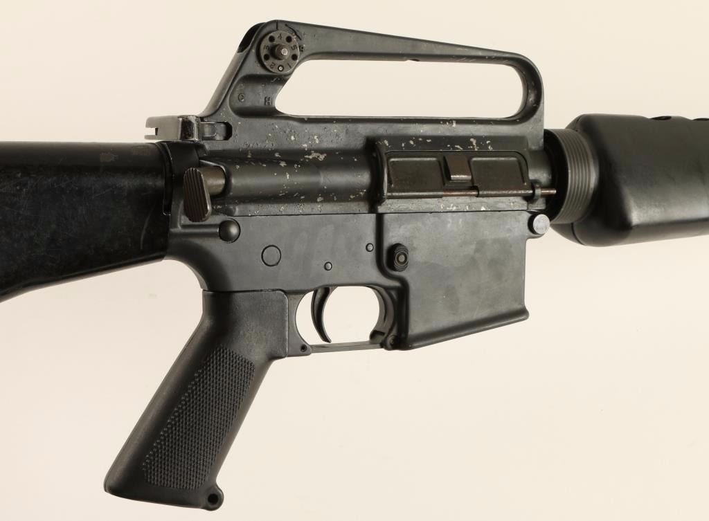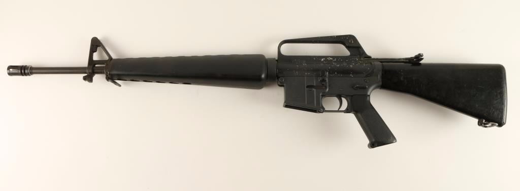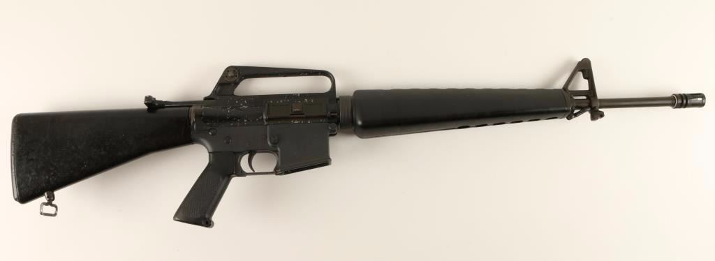 Gas-operated semi automatic assault rifle chambered in .223 Remington, circa 1979. Features a grey finish, 20" barrel with bird cage style flash hider, adjustable A2 winged front sight with bayonet lug, dual aperture rear sight in carrying handle, triangular hand guard, checkered black plastic pistol grip, no magazine, forward assist, safety selector, sling swivels and a black composite shoulder stock. Upper receiver is from a later production rifle as it has the forward assist and appears to have been left in a humid environment as metal parts are starting to rust and coating is flaking. Lower receiver shows only handling marks and scuffs. Action is strong, bore is excellent, and stocks are good with a crack in the stock. Condition is fair to good. ***Modern Firearm***