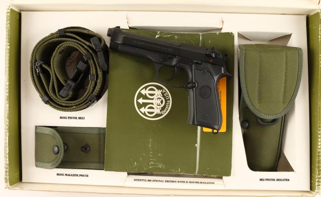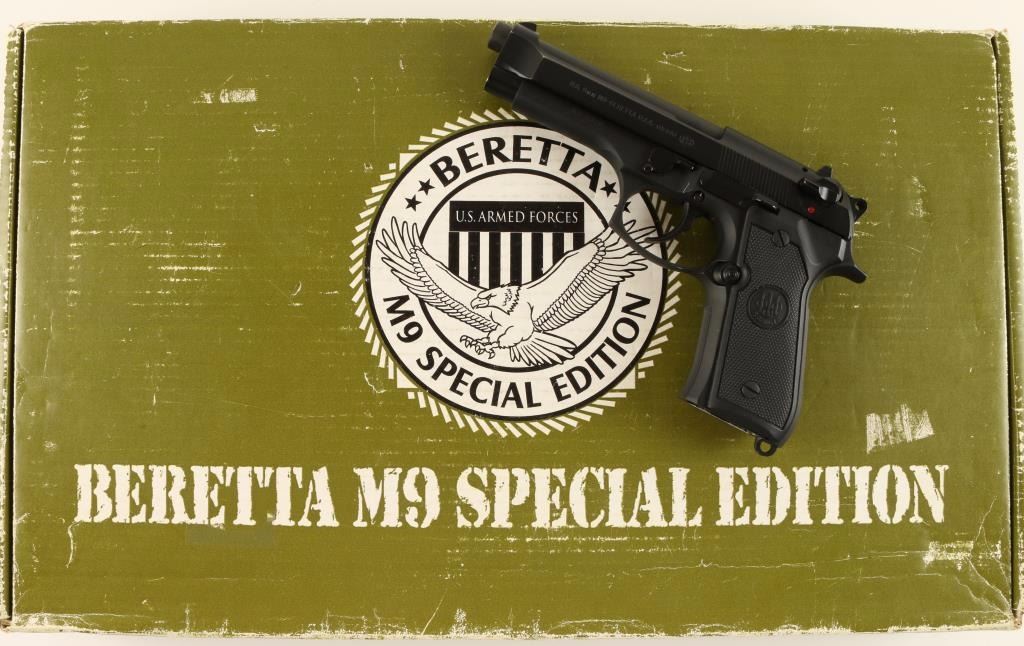 'U.S. Armed Forces Special Edition' Double action semi-automatic pistol chambered in 9x19mm. Features a black coated finish, 5" blued barrel, serrated slide, fixed front sight, adjustable rear sight, lanyard ring, ambidextrous decocker, serrated grip straps, no magazine, and Beretta checkered black plastic grips. Includes original factory box with documents, holster, belt, magazine pouch, and lock. Finish shows light edge wear on slide. Action is tight, bore is dirty but will likely clean , and grips are extra fine. Condition is near excellent in box. ***Modern Firearm***