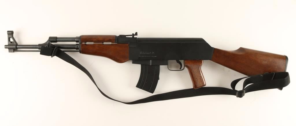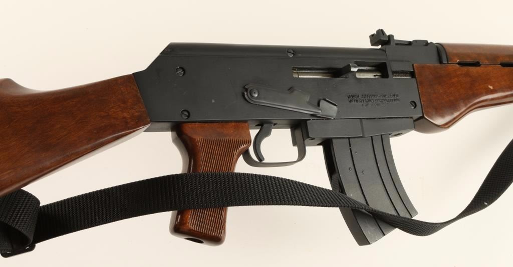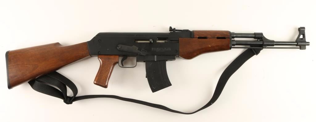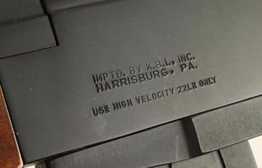 Filipino made semi automatic rifle chambered in .22 Long Rifle, stylized to resemble the AK 47. Features a matte black finish, 18" blued barrel, cleaning rod, shrouded front sight, rear tangent sight, 10 round magazine, safety switch, black nylon sling, serrated trigger, and a full set of wood stocks. Rifle shows light to moderate handle wear with scratches on receiver. Action is strong, bore is very good, and wood stocks are near fine with few blemishes. Condition is very good. ***Modern Firearm***