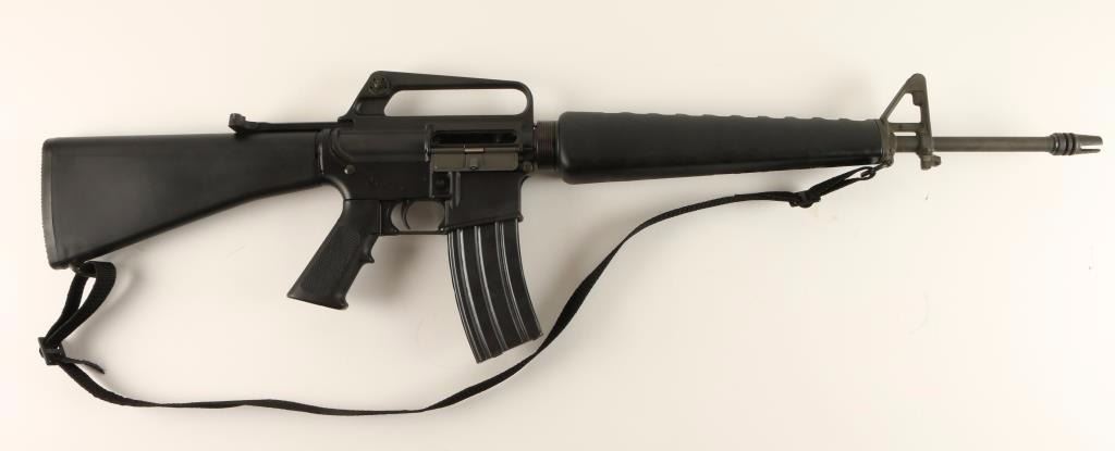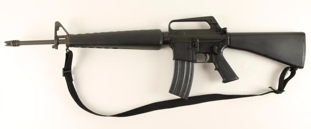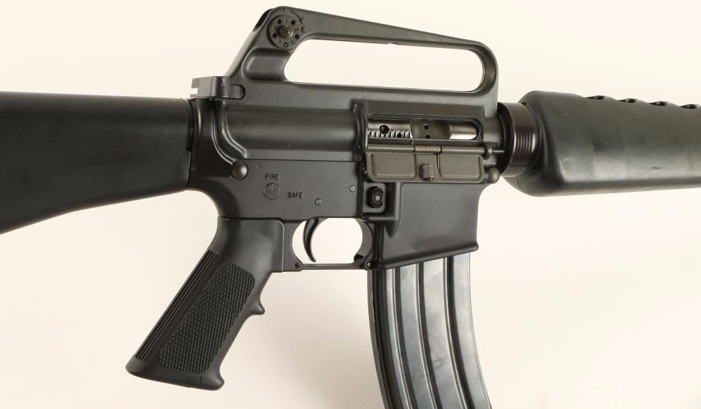Gas-operated semi automatic assault rifle chambered in .223 Remington. Features an matte grey finished SP1 style upper, 20" barrel with flash hider, adjustable A2 winged front sight with bayonet lug, dual aperture rear sight in carrying handle, triangular hand guard, checkered black plastic pistol grip, 30 round magazine, matte black lower receiver, extended safety selector, black nylon sling, and a black composite shoulder stock with trap door. Finish shows only light wear and few scuffs from handling & storage. Action is strong, bore is pristine, and stocks are fine. Condition is excellent. ***Modern Firearm***