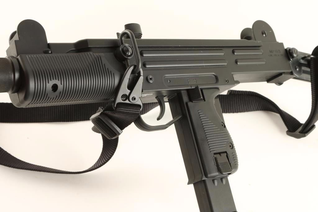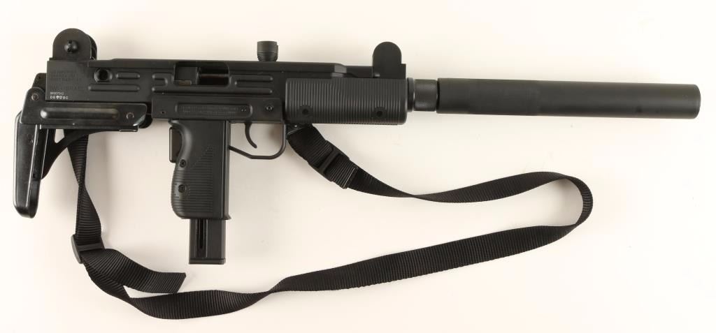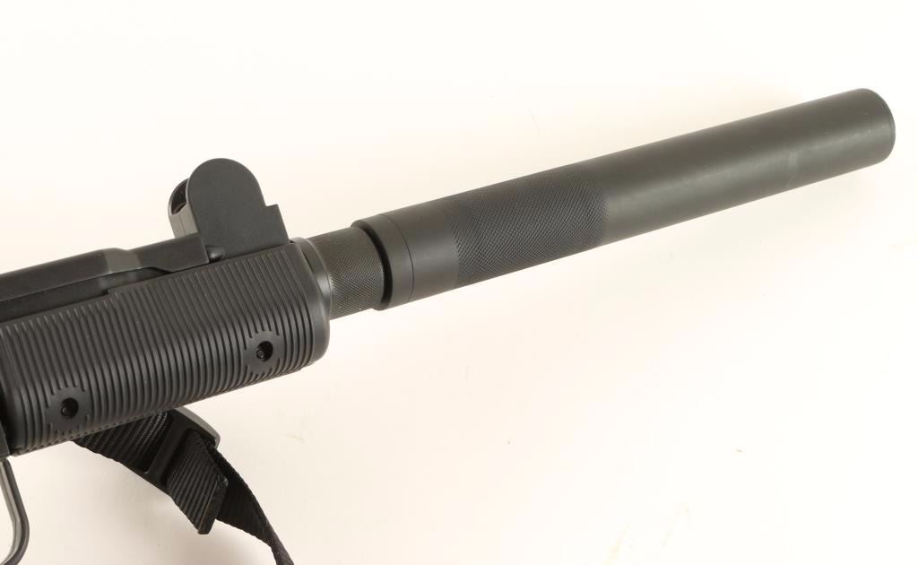 German made Uzi carbine chambered in .22 Long Rifle, made by Walther. Features a matte black finish, 18" barrel with faux suppressor, shrouded front sight, flip-up dual aperture rear sight, grooved forend, safety selector switch, 20 round magazine, grip safety, smooth trigger, black nylon sling, black plastic pistol grip, and folding shoulder stock. Rifle only shows light handling wear with a few scratches on faux suppressor. Action is smooth, bore is excellent, and stocks are fine. Condition is excellent. ***Modern Firearm***