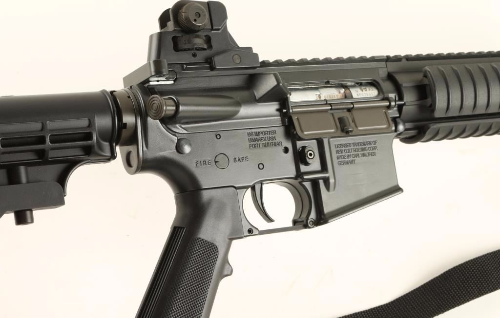 German made AR stylized rifle chambered in .22 Long Rifle, made by Walther. Features a semi-gloss dark grey finish, 16.25" barrel with flash hider, A2 style front sight with bayonet lug, quad-rail forend with covers, removable read adjustable aperture sight, functional charging handle, shell deflector, push button magazine release, A2 style pistol grip, black nylon sling and five position telescoping shoulder stock. No magazine. Rifle shows little to no wear. Action is smooth, bore is excellent, and stocks are fine. Condition is excellent. ***Modern Firearm***