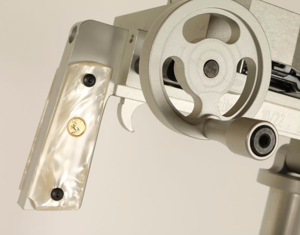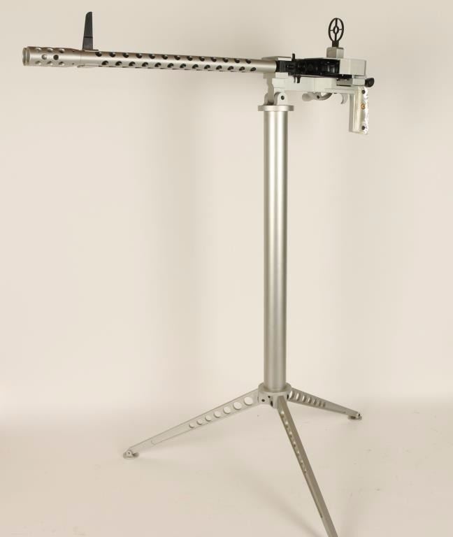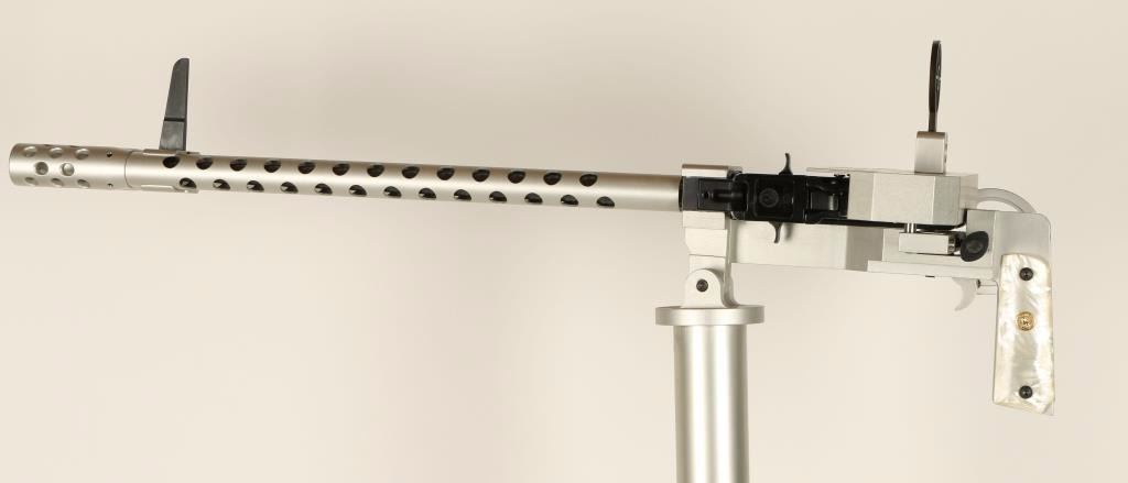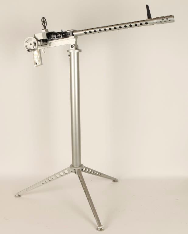 SN: 251-64023/251-63951 Custom gatling gun utilizing two Ruger 10/22 rifles. Features CNC machined aluminum construction with barrel shrouds, muzzle breaks, large open sights, folding tripod stand, hand crank, and Colt medallion faux mother of pearl grips. Includes two 10 round Ruger factory mags. A really fun setup that in now out of production. 10/22 are in excellent condition. Overall condition is excellent. ***Modern Firearms***