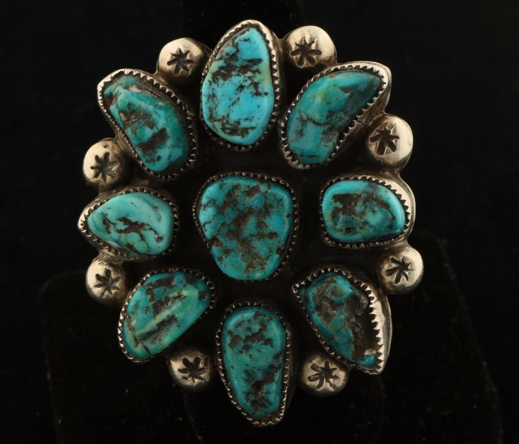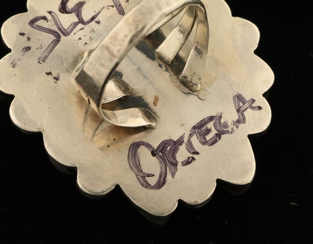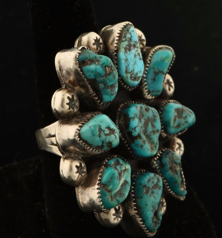 9 Kingman turquoise nuggets-attributable to Gilbert Ortega? The gorgeous turquoise nuggets probably came from the Kingman Mine in Arizona. They form a circle or floral pattern. Each is set in a sawtooth bezel setting. Ring has a triple split shank. Written on the back of the ring when I acquired it was 'ORTEGA'. Since this came from an estate, it could be from one of his shops or the exact meaning. Also written is '$375' which must have been an asking price at one time. If this piece was in Gilbert Ortega's Scottsdale shop, it probably would be marked $375. Ring size is 8 1/4, it measures 1 3/4" long by 1 1/4" wide, and weighs 27.7 grams.