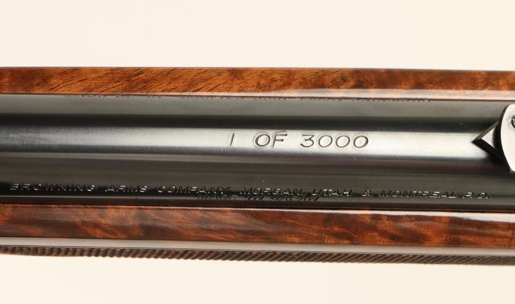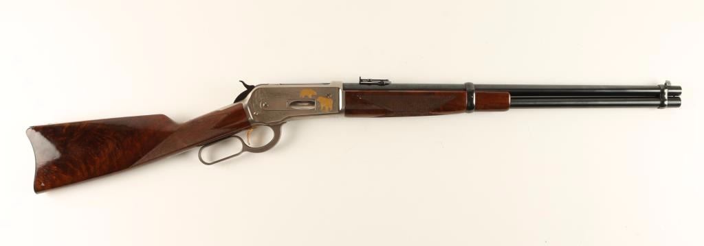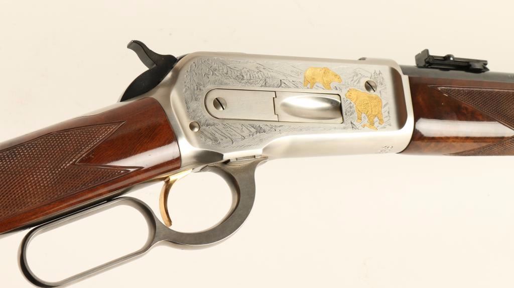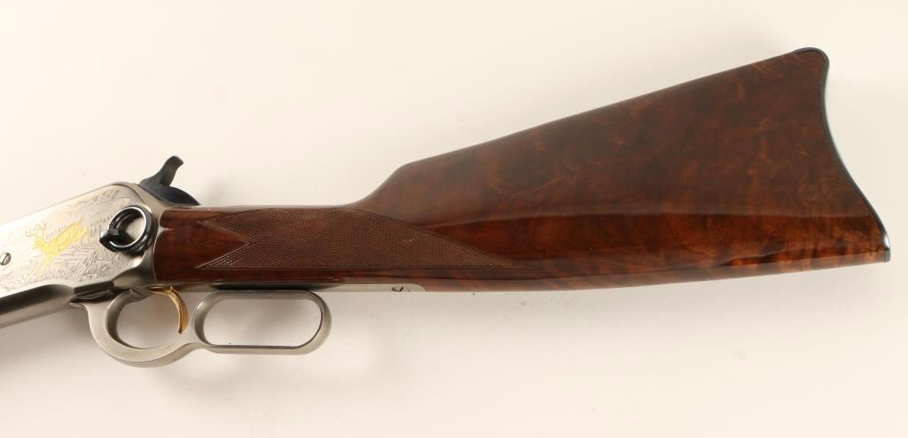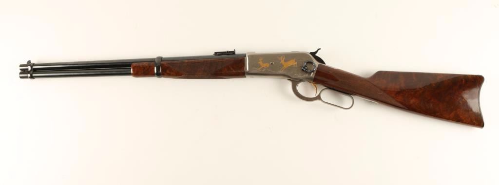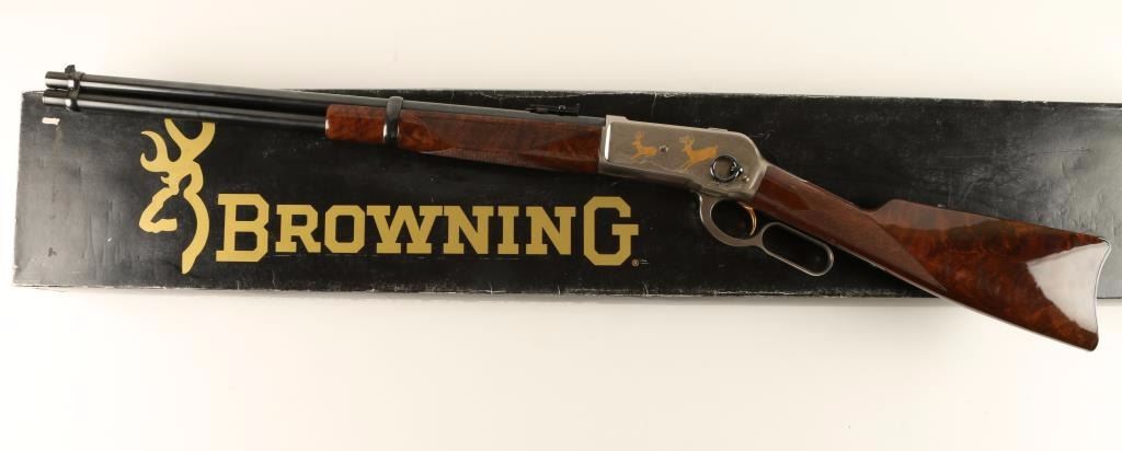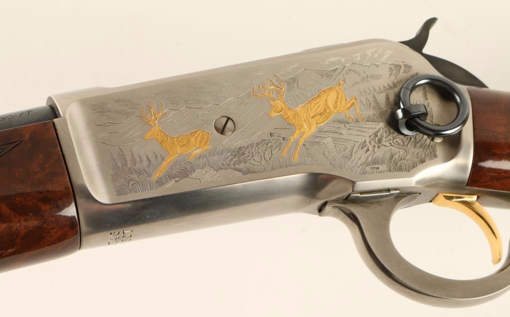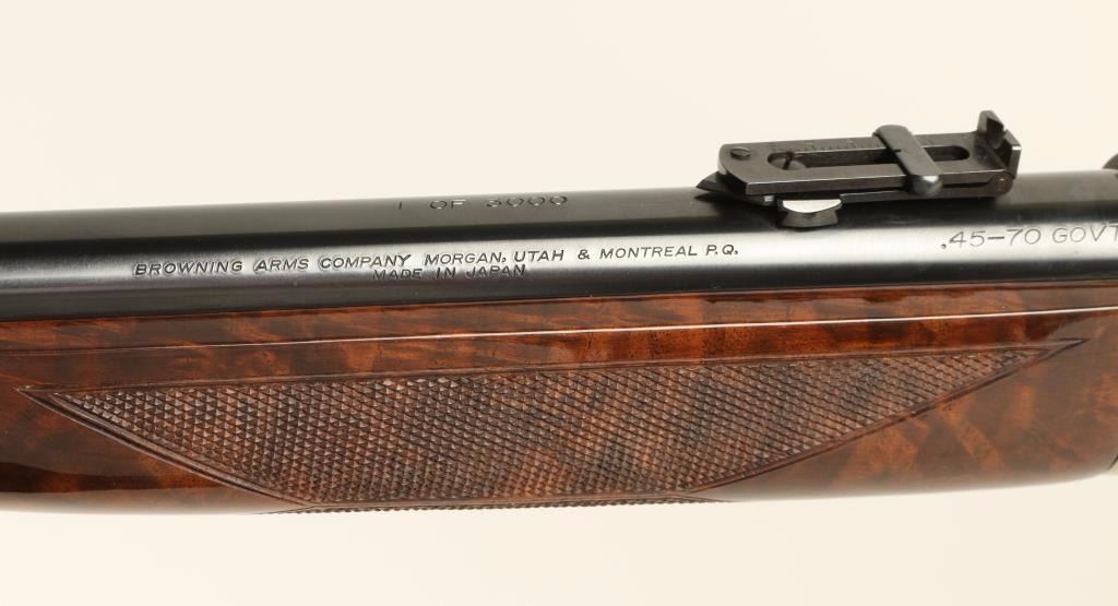 'High Grade' Japanese made lever action repeating rifle chambered in .45-70 Government, and modeled after the Winchester Model 1886. This high grade saddle ring carbine is a limited edition with only 3,000 produced. Features a blued 22" tapered barrel, full magazine tube, pinned blade front sight, folding leaf adjustable elevation rear sight, saddle ring, engraved stainless steel receiver with gold filled deer & bear scenes, serrated hammer spur, smooth gold trigger, steel carbine buttplate, high gloss checkered burl walnut forend and straight grip shoulder stock. Includes original factory box with manual. Finish shows no signs of use or wear. Action is smooth, bore is impeccable, and wood stocks are fine with a few small chips near toe. Condition is near excellent. ***Modern Firearm***