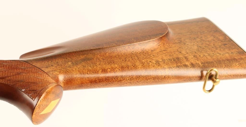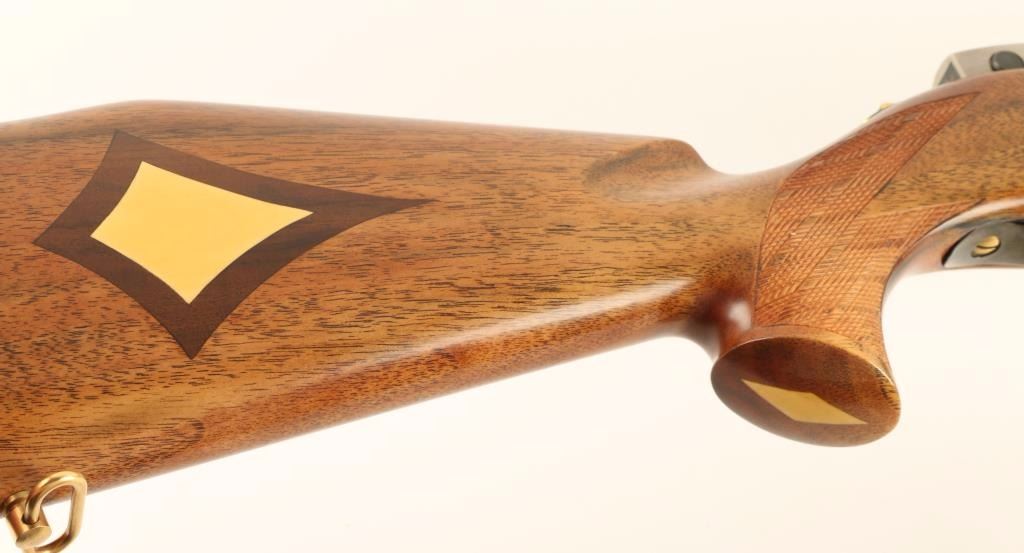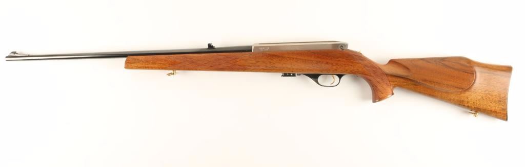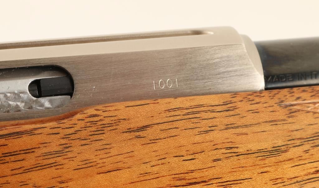 Superb quality Italian made single shot or semi automatic selectable rifle chambered in .22 Long Rifle. The first rifle produced in it's series with lots of special features. Features a blued 24" tapered barrel, ramped front sight with gold bead, double folding leaf rear sight, silver receiver with integral scope rail, jeweled bolt, numerous gold accented pieces, safety switch on tang, serrated trigger, sling swivels, 5 round magazine, and skip line checkered Monte Carlos style satin finished stock with ivory inlays & checkered metal buttplate. Rifle shows little to no wear. Action is smooth, bore is excellent, and wood stock is super fine. Condition is excellent. ***Modern Firearm***