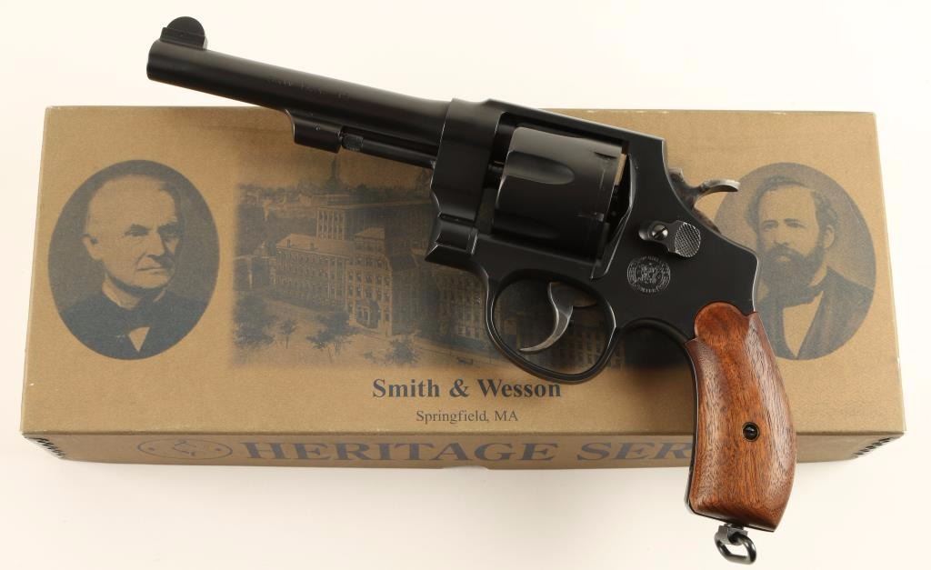 'Heritage Series' Large frame double action revolver chambered in .45 Automatic Colt Pistol. Model of 1917 and part of a limited edition run by the Performance Center for Lew Horton. Features a matte blued finish, 5.5" barrel, high profile blade front sight, notched rear sight, fluted six-shot cylinder, case hardened hammer & trigger, lanyard ring, four-screw frame, and two-piece walnut grips. Includes original factory gold box, documents, and lock. Finish shows only a faint dragline. Action is crisp, bore is pristine, and grips are fine. Condition is near new in box. ***Modern Firearm***