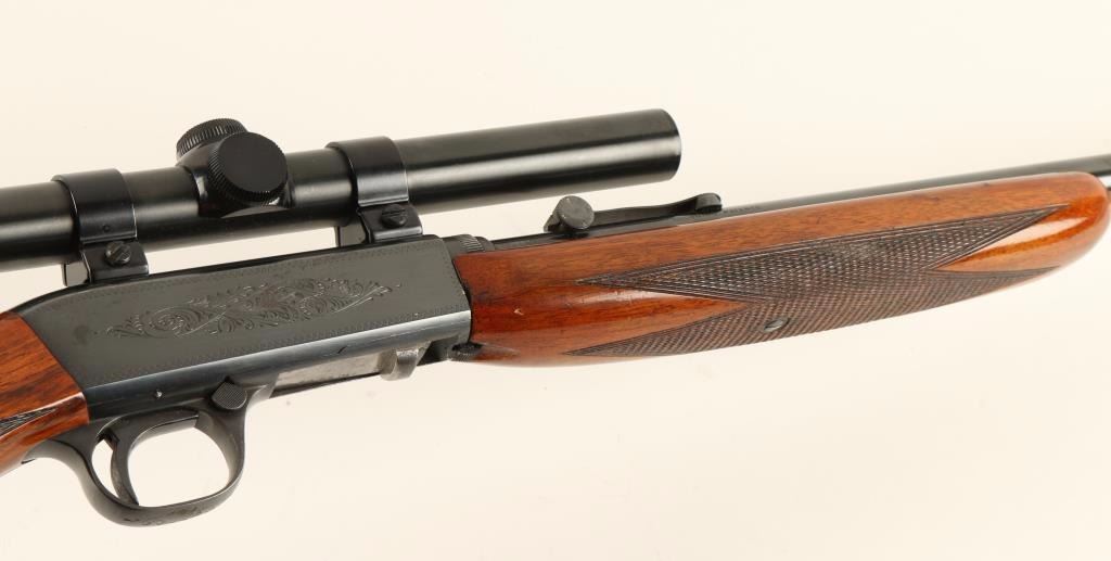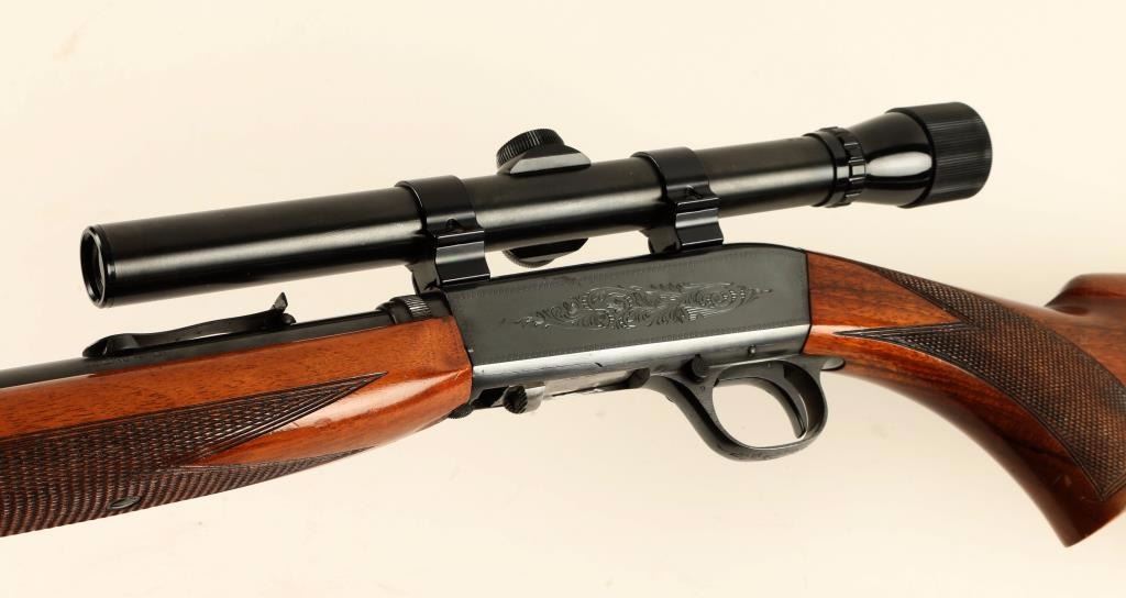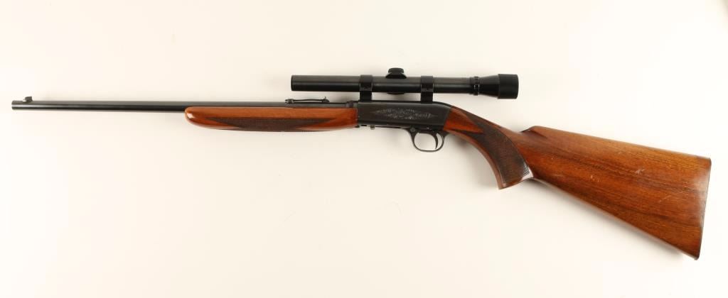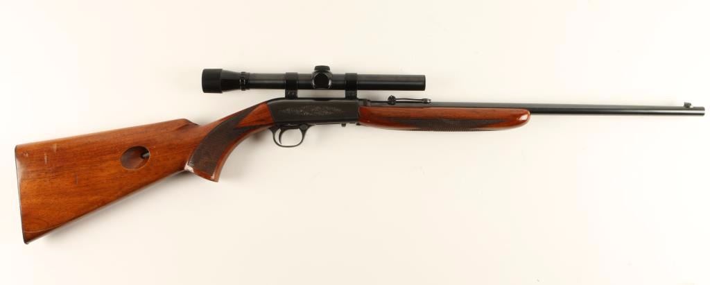'Grade I" Early Belgium made tube fed blowback operated semi automatic rifle chambered in .22 Long Rifle, circa 1956. Features a blued finish, 19.25" take-down barrel, dovetailed front sight, adjustable wheel rear sight, engraved steel receiver, 11 round tubular magazine, push button safety, installed Weaver D4 fixed power scope, and checkered walnut forend & pistol grip shoulder stock with serrated metal buttplate. Finish retains 96% original bluing with few minor losses and single spot of oxidation on right side of receiver. Action is smooth, bore is excellent, markings are crisp, and wood stock is good with moderate dings & a crack in either side of the wrist. Condition is very good+. ***C&R Firearm*** ***Modern Firearm***