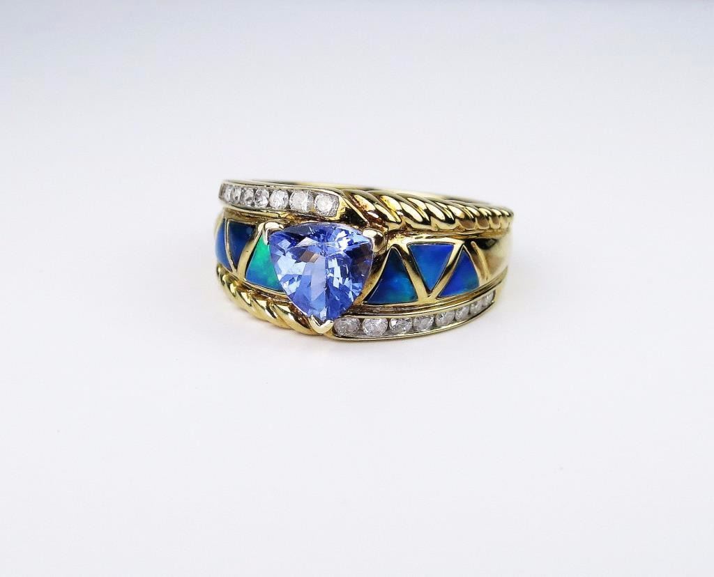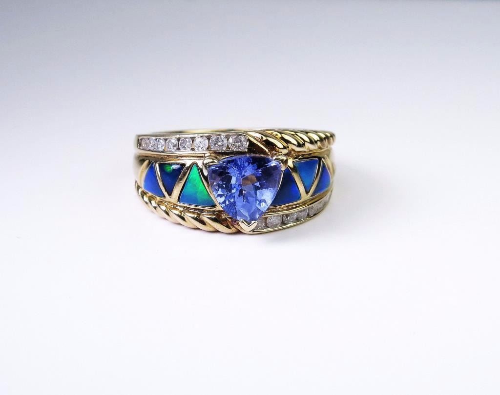 Set with nice trilliant cut Tanzanite weighing approx. 1.20 carats and side diamonds with six fine black opal inlay. Very labor intensive.