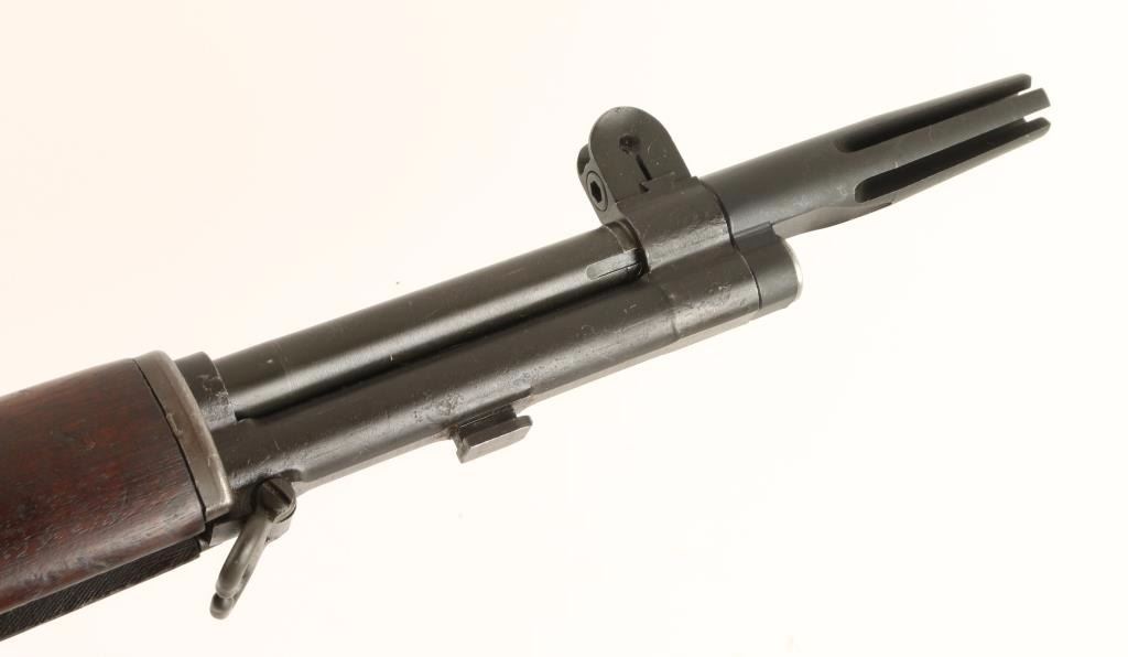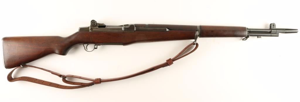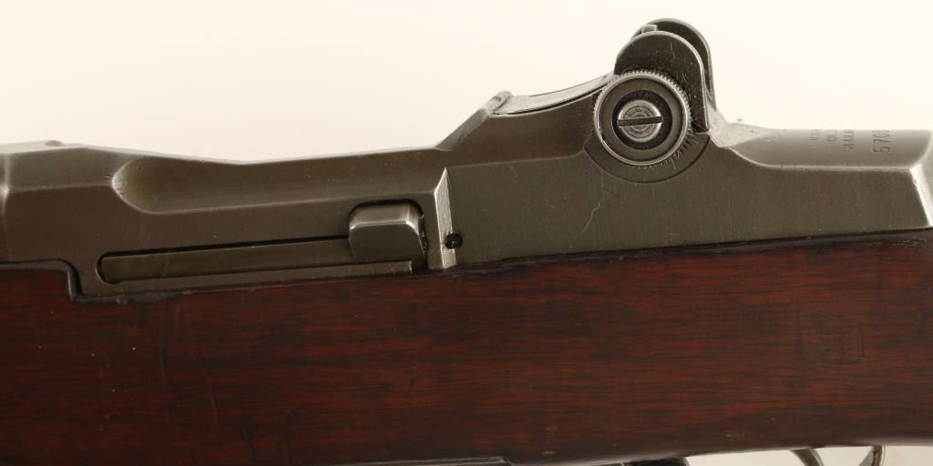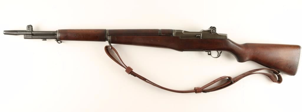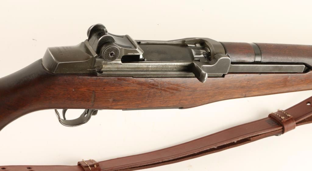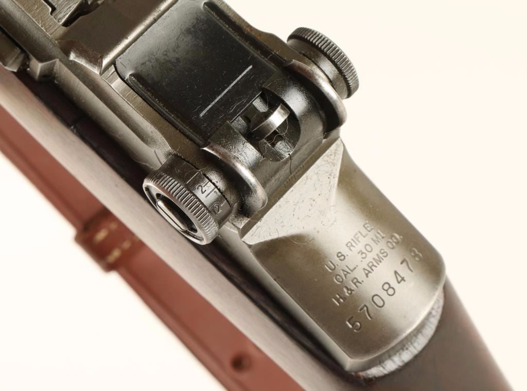 U.S. Military contracted clip-fed semi automatic service rifle chambered in .30-06 Springfield, circa 1955. Features a blued finish, 24" barrel marked HRA 12-55, flash hider, winged front sight, adjustable rear aperture sight, bayonet lug, brown leather sling, HRA marked bolt, checkered metal trapdoor buttplate, plain walnut handguard and shoulder stock with circled "P" and other illegible cartouches. Rifle shows some high edge wear with 85% finish intact. Action is strong, bore is excellent, and wood stocks very good with minimal dings & scrapes. Condition is excellent. ***C&R Firearm*** ***Modern Firearm***