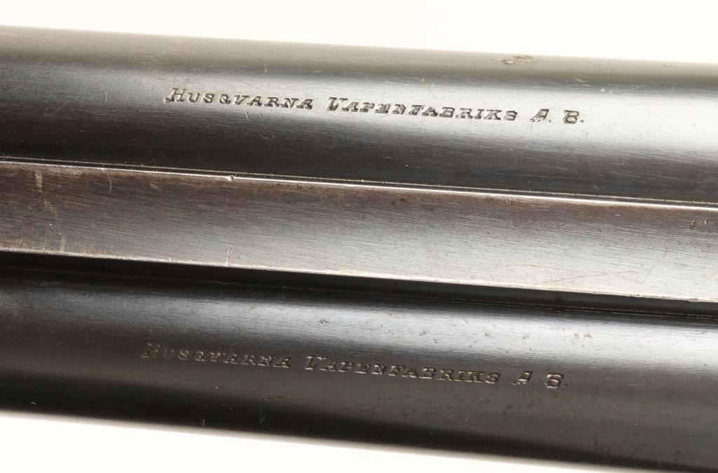 Swedish made double barrel side by side shotgun chambered for 2 3/4" 12 gauge shells. Features blued 29.4" barrels, solid concave rib, brass bead front sight, exposed hammers with checkered spurs, side lock actions, case hardened receiver, double triggers, extractors, sling swivels, and a straight grip walnut shoulder stock with metal buttplate. Barrels retain approximately 70% bright bluing with wear from carrying, a few heavy scratches, and a dings on crown. Receiver has turned to an even silver patina with some light erosion and vivid case colors in protected areas. Right action is frozen, left action performs well, bores are very good, and stock is fine. Condition is good. ***C&R Firearm*** ***Modern Firearm***