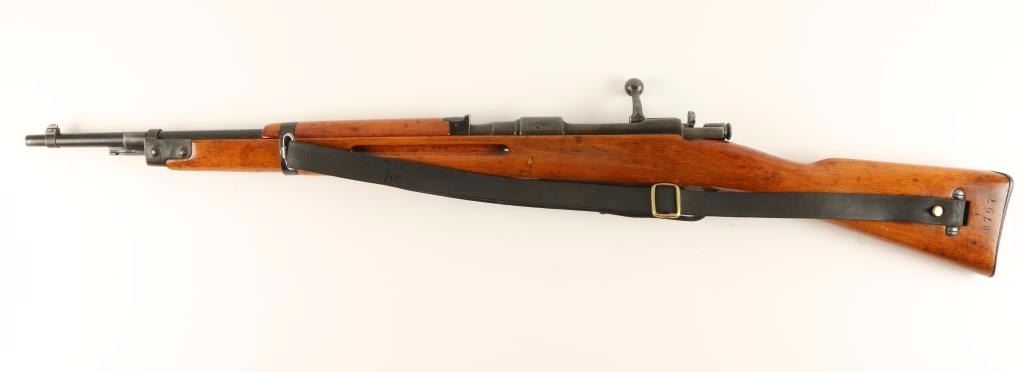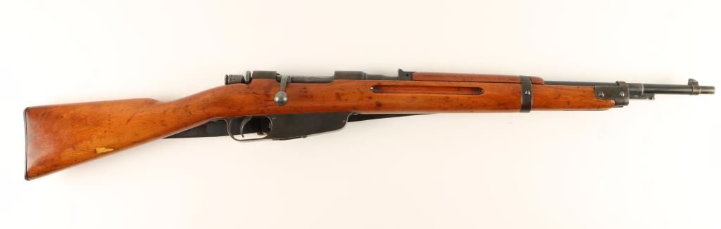 Blued bolt-action Italian military rifle with a 21.06" barrel, leather sling, no import marks, "Terni" stamp, 1939 breech date and wood stock. Bluing has faded to a mottled grey color with edge wear on much of the rifle, surface rust on the buttplate and scratches on the bottom metal. Bore is turning frosty with good rifling. Action works well. Wood stock serial number matches barrel serial number. Stock has been refinished over prior marks and repairs but is not too small. Condition is good to very good. *Modern Firearm*