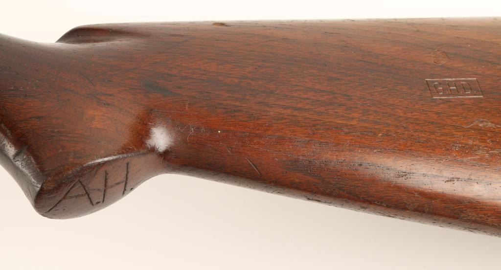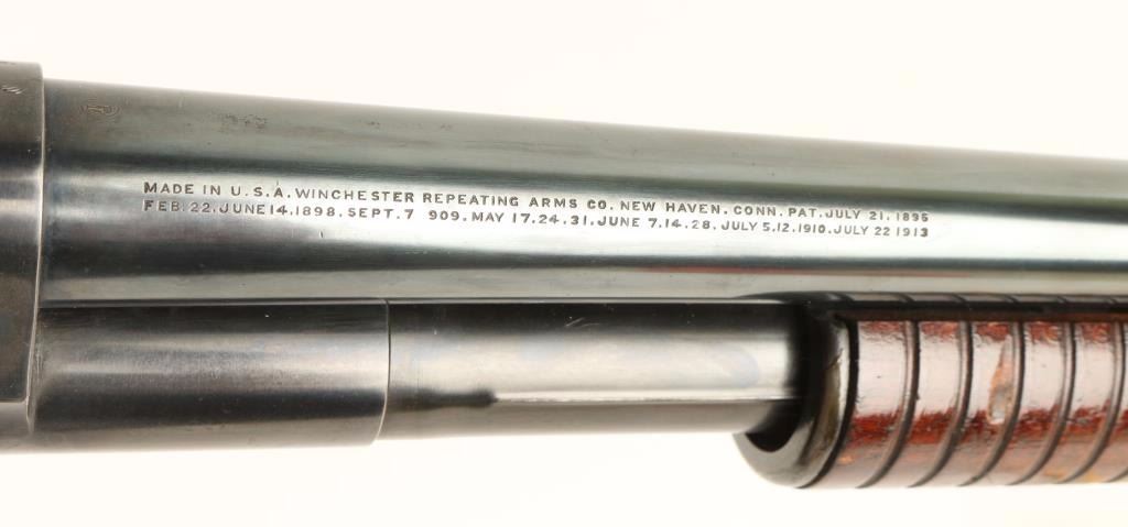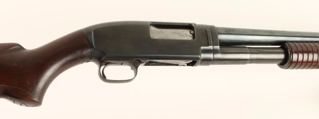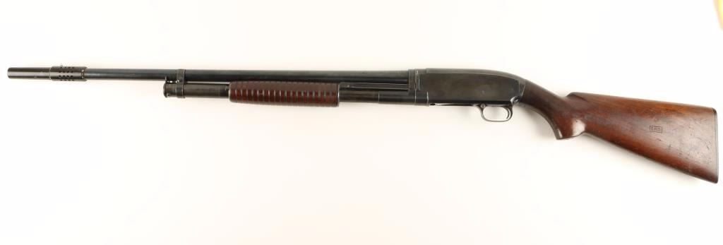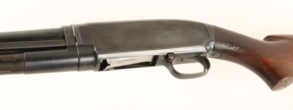 Ordnance marked slide action take-down shotgun chambered for 2 3/4" 12 gauge shells, circa 1940. Features a blued finish, 23.5" take-down barrel, extended choke marked XFC, large silver bead front sight, 1/2 tube magazine, grooved wood slide handle, push button safety, smooth trigger, and pistol grip shoulder stock with factory buttplate. Receiver & barrel are stamped with a Flaming Bomb and stock is stamped with a Crossed Cannons & "G.H.D." cartouche. Shotgun retains approximately 80% bright finish, shows light wear, and a small spot of dark oxidation on receiver. Action is smooth. bore is excellent, and wood stocks are very good with dings & rubs. Condition is very good+. ***C&R Firearm*** ***Modern Firearm***