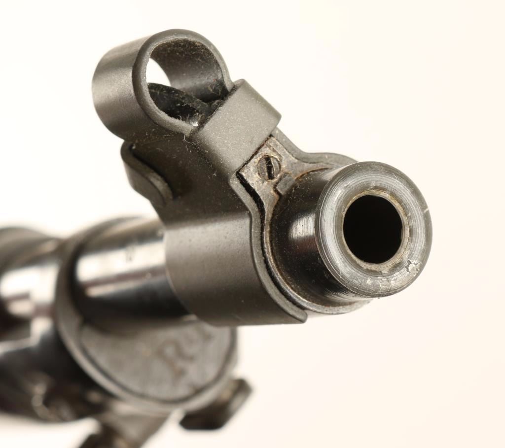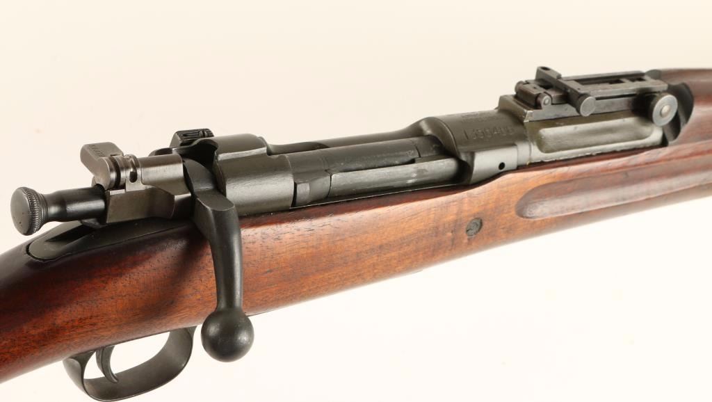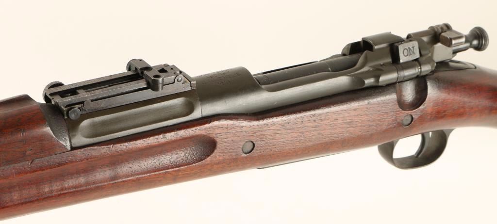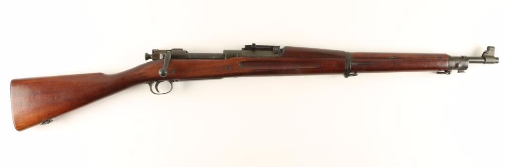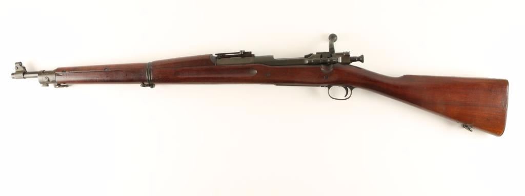 Rebuilt U.S. Military bolt action rifle chambered in .30-06 Springfield, circa 1930. Features a parkerized finish, star-gauged 24" barrel marked "SA(flaming bomb)8-32", blade front sight with cover, adjustable rear sight graduated to 2,700 yards, integral five round box magazine with cut-off switch, bent bolt handle marked "HO 31", safety switch on bolt, smooth trigger, two barrel bands with bayonet lug, three sling swivels, metal trapdoor buttplate, full smooth walnut handguard and straight grip shoulder stock marked "4". Rifle retains approximately 92% arsenal refinish with light wear. Action is smooth, bore is pristine, and wood stocks are fine. Condition is excellent. ***C&R Firearm*** ***Modern Firearm***