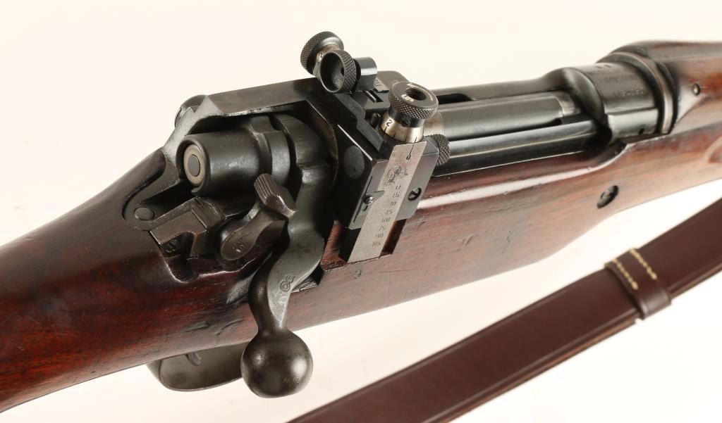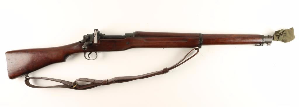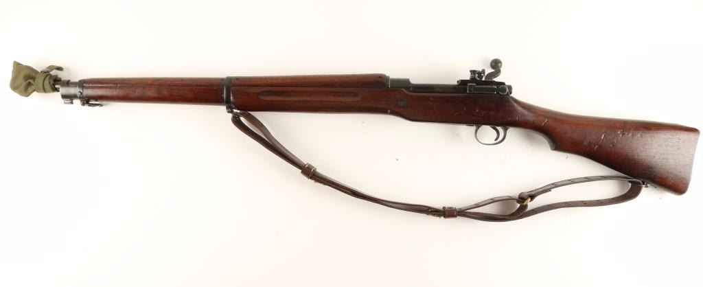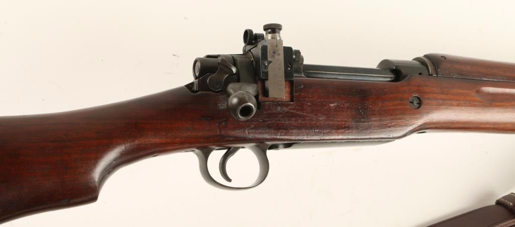Blued bolt-action U.S. military rifle with a 26" barrel stamped "E 9-18" with flaming bomb ordnance proof, cloth muzzle cover, leather sling, altered (de-eared) receiver bridge with a Lyman adjustable rear peep sight, wood stock and plated trap door buttplate. Bluing has edge wear, rubbing and fading. Bore is a little frosty with strong, sharp rifling. Action works well. Wood has dings, scratches, rubs and a "2L" proof. Butt plate has rough surfaces on toe and heel. Condition is good to very good. *Modern Firearm*