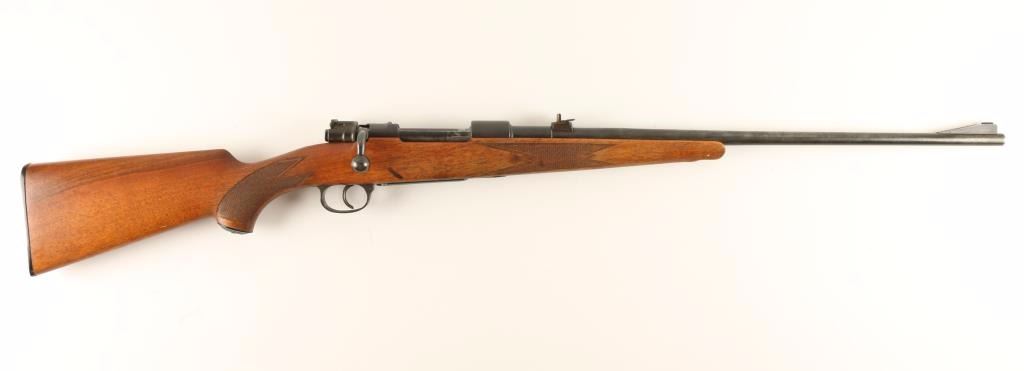 Bolt action sporting rifle presumably chambered in 8mm Mauser, assembled using WWII parts. Features a blued finish, 24" unmarked barrel, ramped front sight, flip up rear sight, refinished & unmarked receiver, 5 round internal box magazine, safety switch on bolt, bent bolt handle, grooved trigger, and checkered Monte Carlo style wood stock. Rifle shows light finish remaining on barrel with few spots of surface rust and refinished receiver retains 98% dull blue finish. Action is smooth, bore is very good, and wood stock is fine. Condition is good as sporterized. ***C&R Firearm*** ***Modern Firearm***