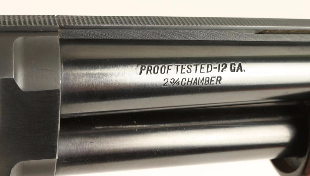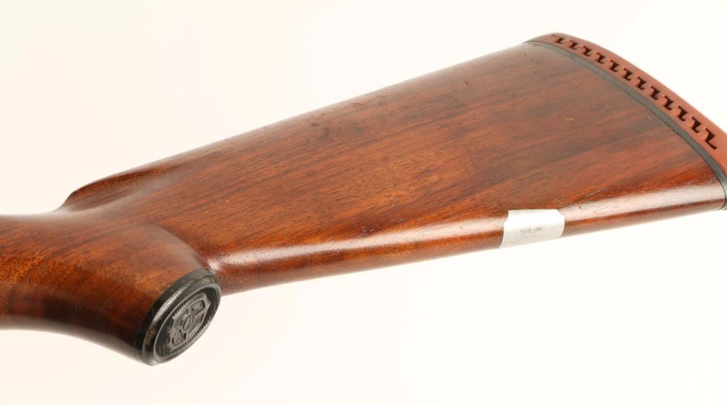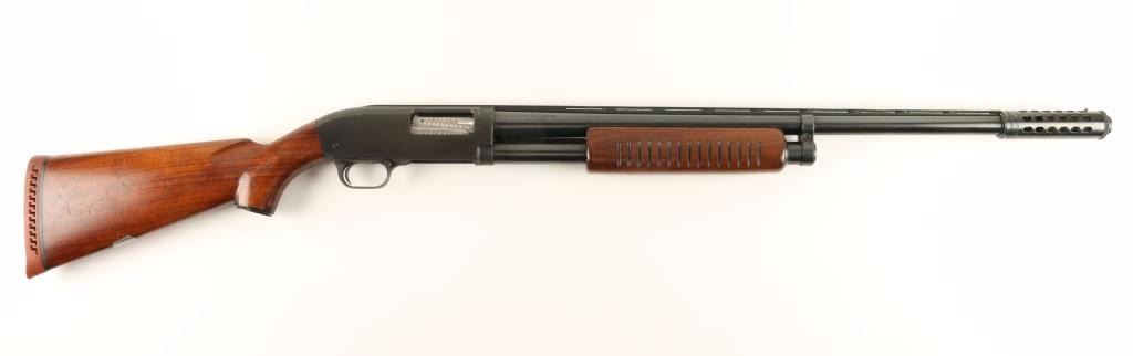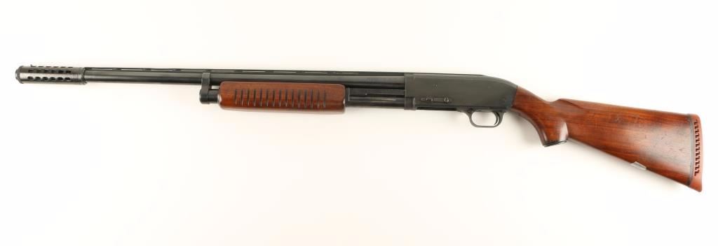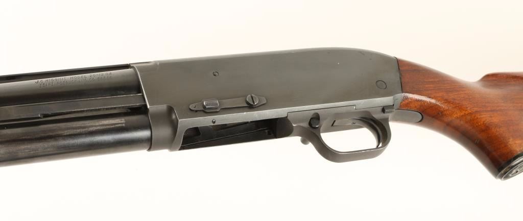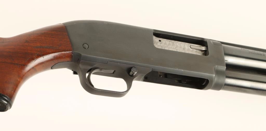 Slide action repeating shotgun chambered for 2 3/4" 12 gauge shells. Features a blued finish, 22" ventilation ribbed barrel with Power Pac choke, large brass bead front sight, center white bead sight, magazine cut-off switch, 1/2 tube magazine, grooved wood slide handle, push button safety, smooth trigger, and pistol grip shoulder stock with rubber recoil pad. Shotgun shows very little wear with approximately 96% finish intact. Action is smooth, bore is good, and wood stocks are fine with very few blemishes. Condition is very good+. ***Modern Firearm***