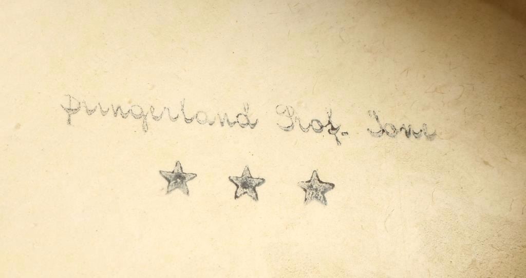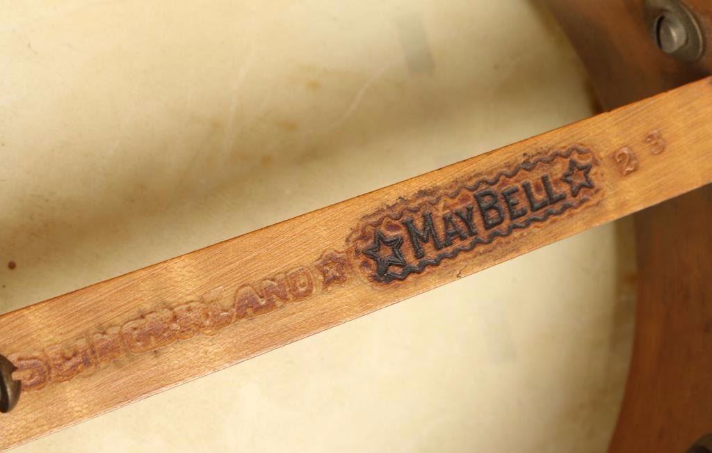 Great little concert scale banjo uke, stamped SLINGERLAND and MAY BELL on strut inside rim. Model 23, featuring 3-piece neck with veneered, capped heel; high quality 6-7/8" maple rim with bird's eye veneer, 12 flat hooks and L-shoes. Full thickness 15-fret fretboard with pearl diamond position markers and star on headstock. High quality skin head, probably original, with new old-fashioned bridge. All-original hardware, measures 20"x7 1/4"x3".