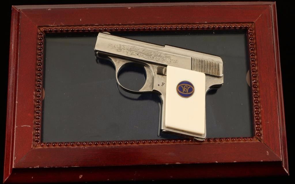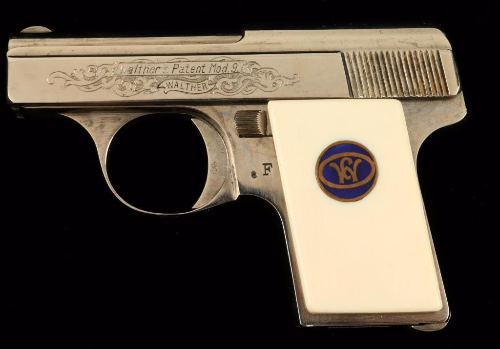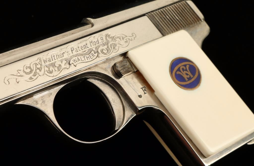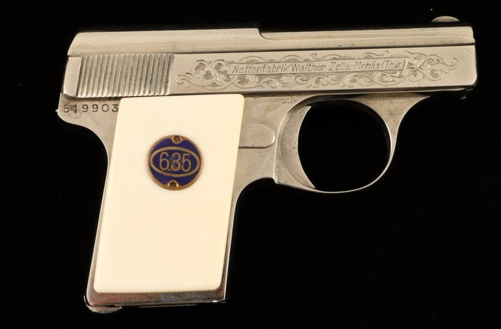Belgium made engraved semi-automatic pocket pistol chambered in 6.35mm, circa 1920's - 1930's. Features a nickel plated finish, 1 7/8" barrel, hand engraved slide in scroll motif, fixed sights, thumb safety switch, early 6 round embossed Walther magazine, and two piece ivory medallion grips. Includes a velvet lined wood display case with glass top. Finish show only superficial scratches with 96%+ original nickel intact. Action is smooth, bore is very good, and ivory grips are fine. Condition is excellent. ***C&R Firearm*** ***Modern Firearm***
