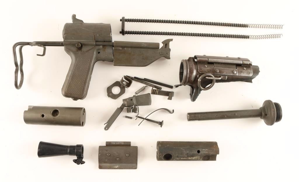 'US M3" Including two pieces of cut-up receiver, two bolts, 8" barrel, flash hider, guide with springs, trigger, trigger guard, pins and other internal parts. Includes a diagram with measurements. Condition is good.