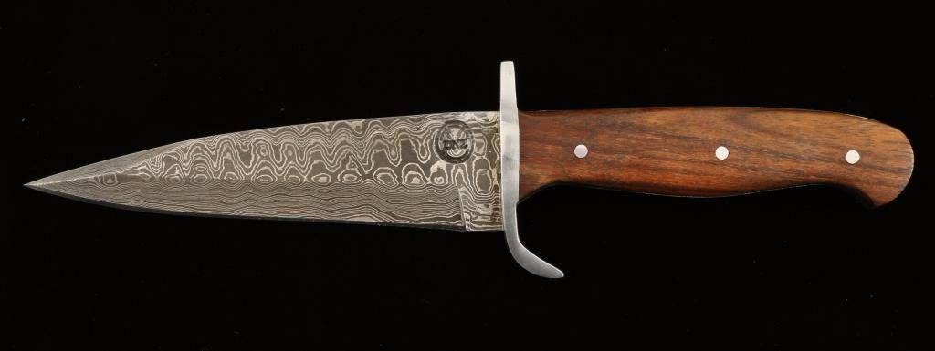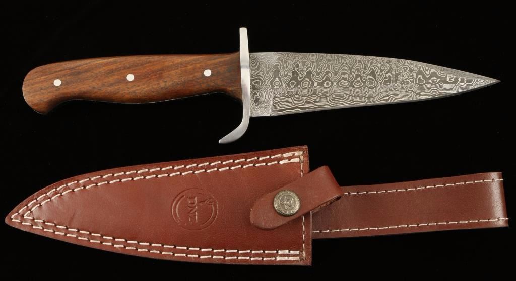 Damascus Steel with a Walnut Wood Handle and silver/aluminum guard. The blade is approx. 6" and the handle is approx. 5 1/4". The blade is custom forged, hand pounded/folded steel with 250 layers of 1095 and 15N20 steel. A high quality leather sheath is provided. Everything is USA handmade within the family. Approx. 8 hours of work went into this knife and sheath. Kevin Johnson, DNZ Trading Company Mint.