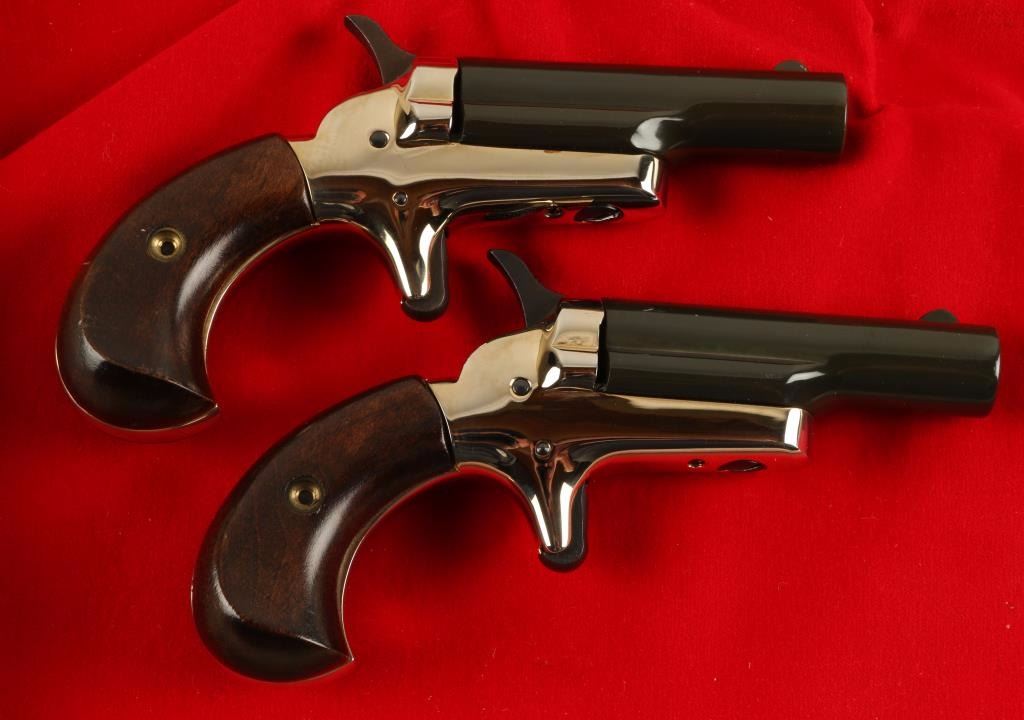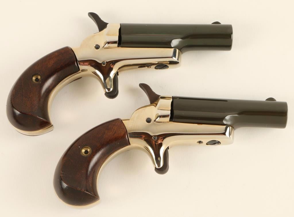 '4th Model' Cased consecutive numbered pair of single shot derringers chambered in .22 short, circa 1960's. Feature 2.5" swing out barrels, fixed front sights, nickel plated frames, spur triggers, checkered hammer spurs, and birds head walnut grips. Includes a felt lined wood frame with plexiglass top. Finishes show little to no wear. Actions are sound, bored and excellent and wood grips are fine. Condition is excellent. ***C&R Firearm*** ***Modern Firearm***