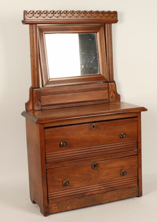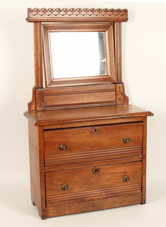 Two drawers with a mirror that is nicely carved on the top edge. Measures 37"x22"x11". Shows age. Could be used on top of a dresser or vanity for extra pizazz.