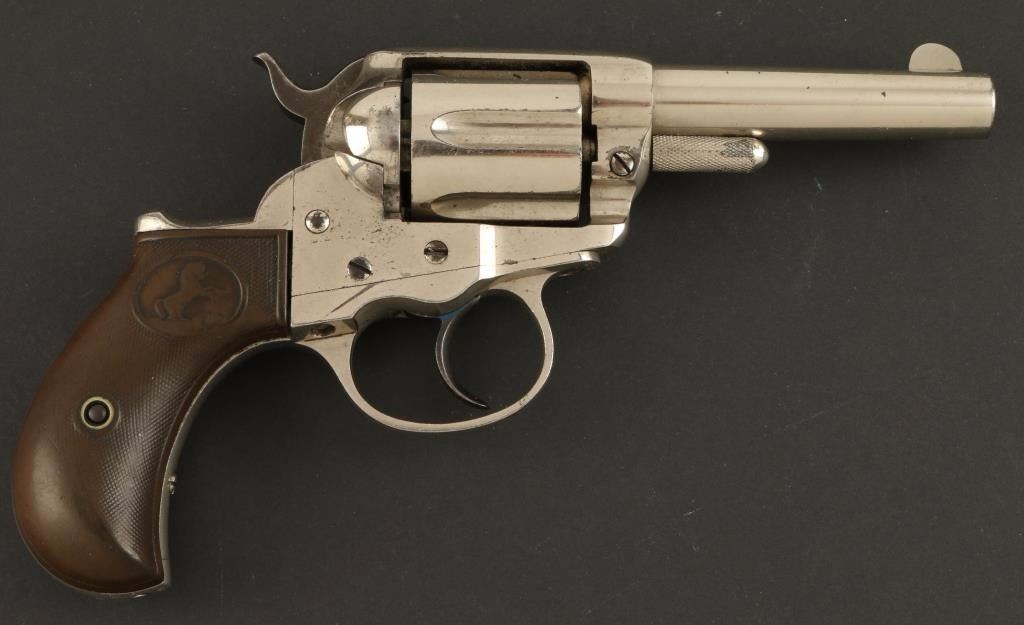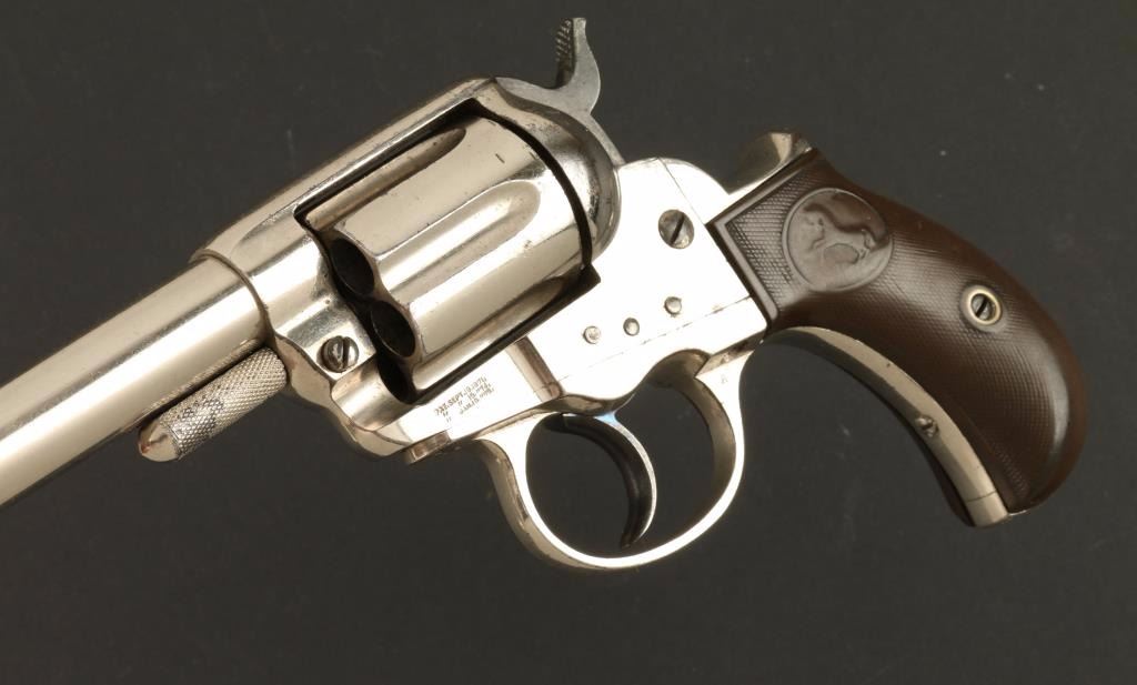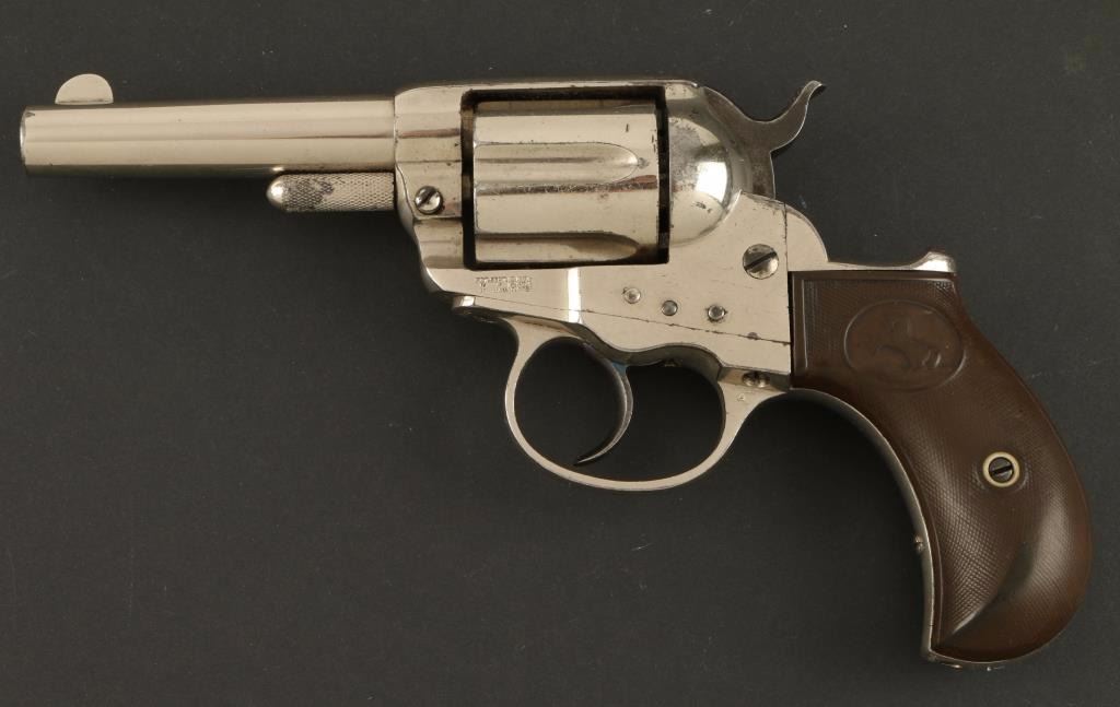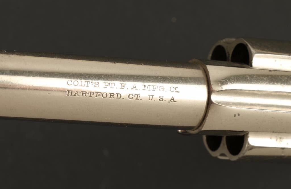'Sheriff's Model' Nickel plated double action revolver chambered in .38 Colt, circa 1886. Features a 2.5" acid etched barrel, no ejector rod, blade front sight, v-notched rear sight, long fluted cylinder, steel frame, smooth trigger, checkered hammer spur, large checkered cylinder-pin head, matching serial numbers, and Rampant Colt bird's head checkered hard rubber grips. Revolver retains 90% original nickel finish with few small losses and handling wear. Markings are good including the barrel etching. Action is mechanically sound, bore is very good, and grips are worn smooth. Condition is excellent. ***Antique Firearm***