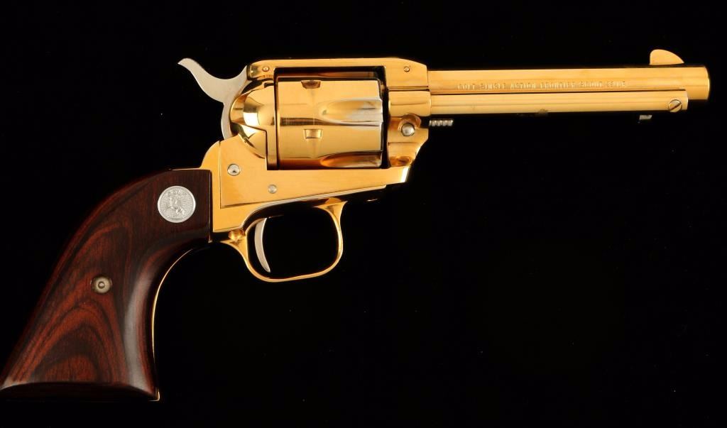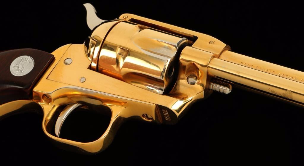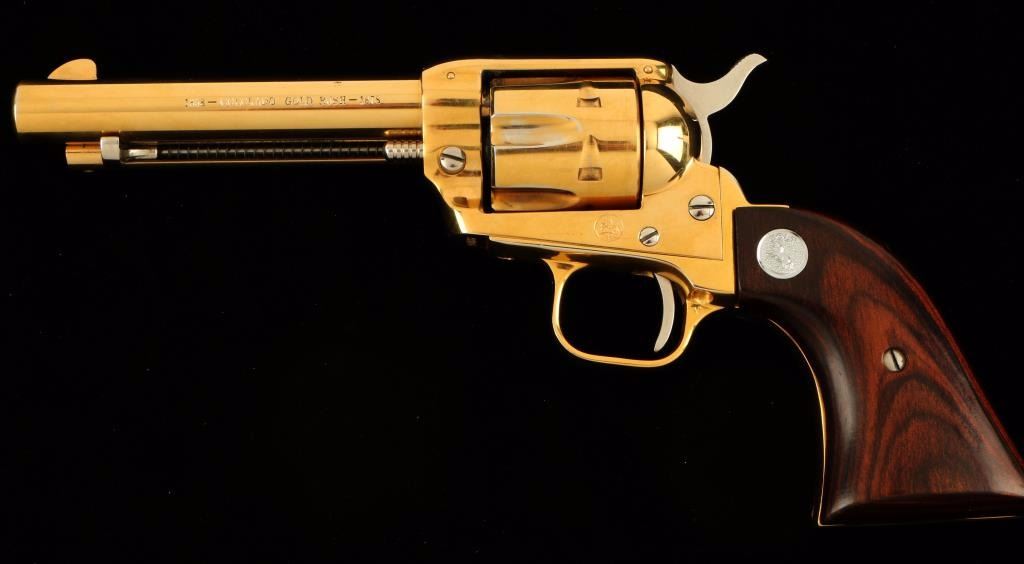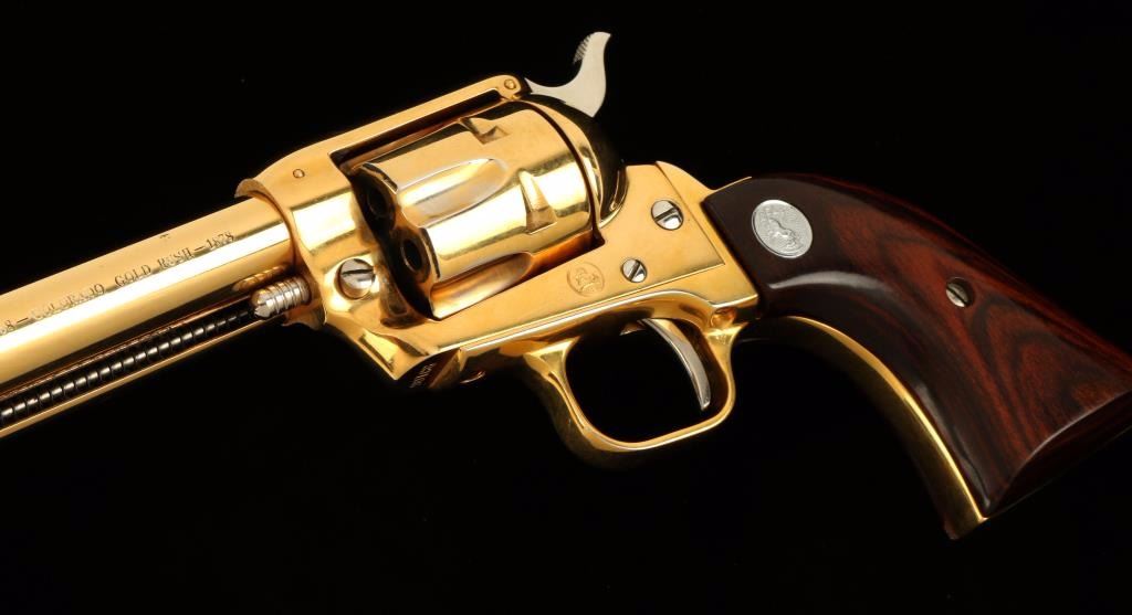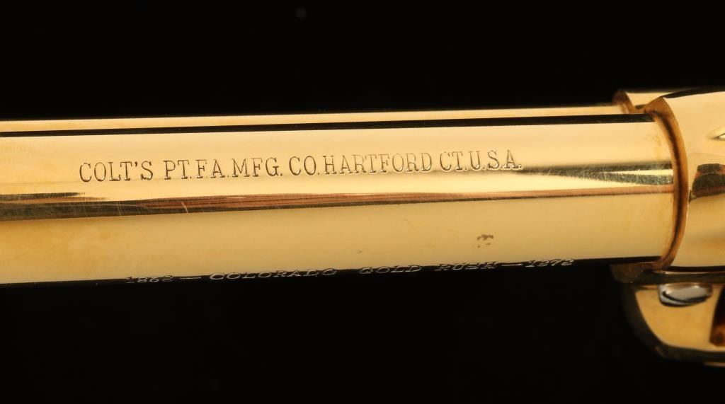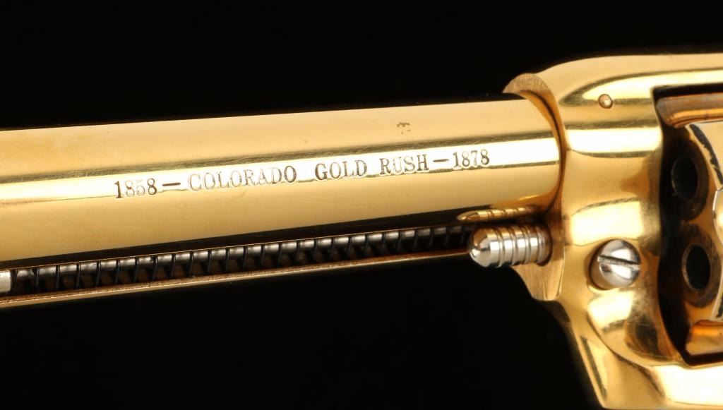 '1858-Colorado Gold Rush-1878' Single action commemorative revolver chambered in .22 Long Rifle, circa 1966. 1 of only 1,350 produced. Features a gold wash finish with stainless accents, 4 3/4" barrel, ejector rod, blade front sight, notched rear sight, fluted six-shot cylinder, checkered hammer spur, and Colt medallion two-piece rosewood grips. Finish retains 90% gold wash with handling wear and gold wearing off in the cylinder flutes. Condition is very good. ***C&R Firearm*** ***Modern Firearm***