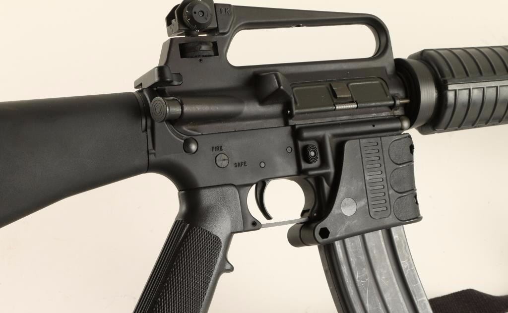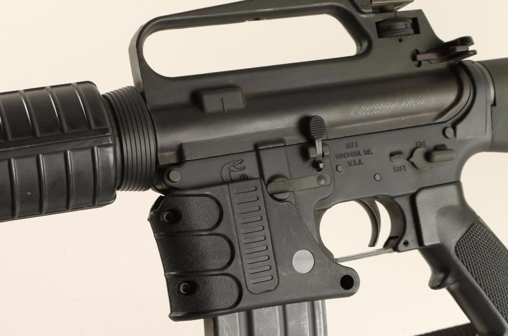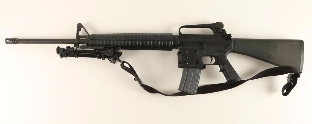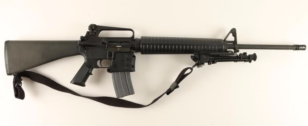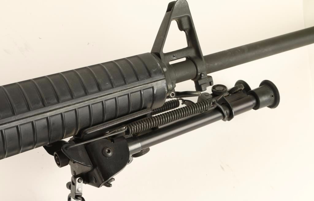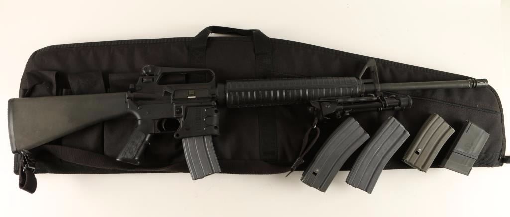 Gas-operated semi-automatic AR style rifle chambered in .223 Remington/5.56 NATO. Features a matte finish, 24" HBAR barrel with bird cage style flash hider, adjustable A2 winged front sight with bayonet lug, dual aperture adjustable rear sight in carrying handle, forward assist, 30 round magazine, magazine well grip extension, black nylon sling, safety selector, adjustable Harris bi-pod and black composite forend & shoulder stock with trap door. Includes a black nylon padded soft case with four extra magazines, (2) 30 round, (1) 25 round & (1) 20 round. Finish is impeccable with the only wear being on the rear sight adjustment dial. Action is strong, bore is excellent, and stocks are fine. Condition is excellent. ***Modern Firearm***