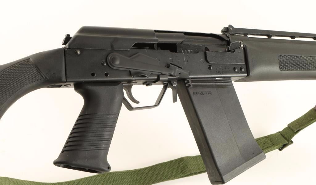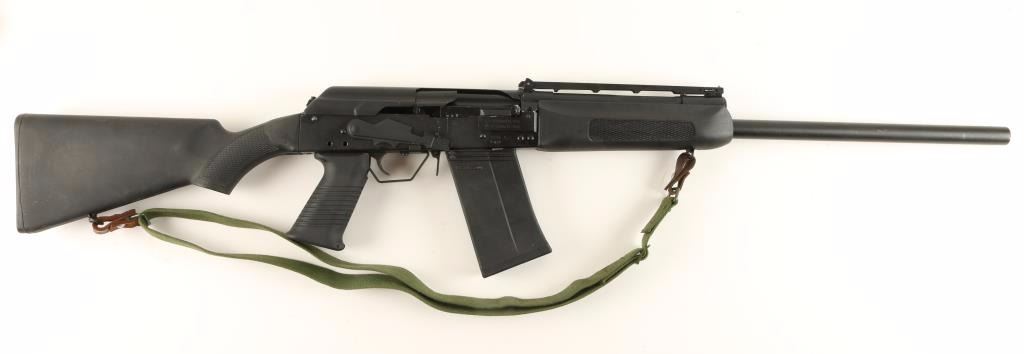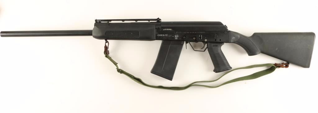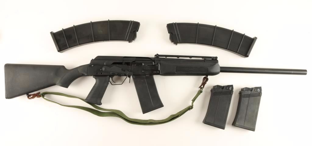 Russian made AK platform semi automatic shotgun chambered for 3" 12 gauge shells. Features a matte black finish, 23" barrel, sight consisting or a serrated rib and brass bead, side mounted scope rail on receiver, Tapco trigger, green canvas sling, safety switch, 5 round magazine pistol grip with compartment, and checkered black synthetic forend & pistol grip shoulder stock. Includes a black hard rifle case, documents, two 5 round magazine, and two ill-fitting 12 round Sure Fire magazines. Shotgun shows some light handling marks and high edge wear on charging handle. Action is smooth, bore is bright, and stocks are fine. Condition is excellent. ***Modern Firearm***