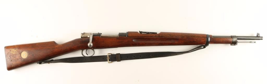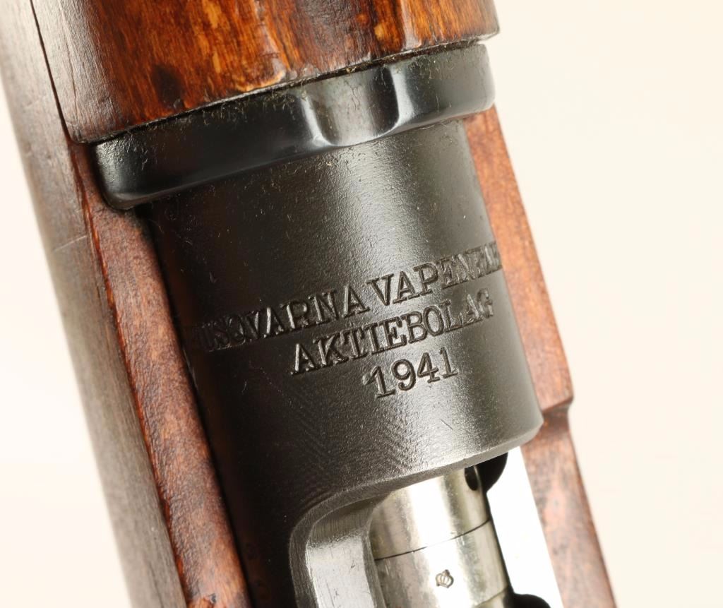 Blued bolt-action Swedish military rifle made by Husqvarna with a 23-3/4" barrel, cleaning rod, Glass Dist. import marks, mismatched serial numbers, leather sling, 1941 breech date, stock disc and wood stock. Bluing has edge wear, scratches and rubs but nothing too drastic. Bore is shiny with good rifling. Action works well. Wood has sharp edges and little damage. Condition is very good to excellent. *Modern Firearm*