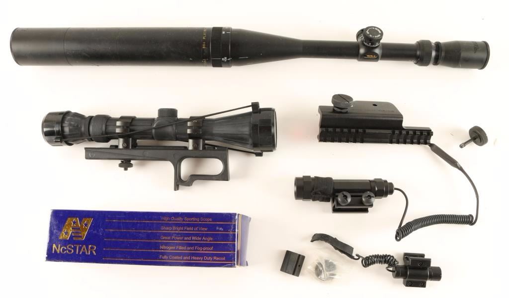 Including; BSA Platinum BD6 24x44 scope, Bec scope, NC Star scope 2x20, (1) tactical flashlight and an M14 scope mount.