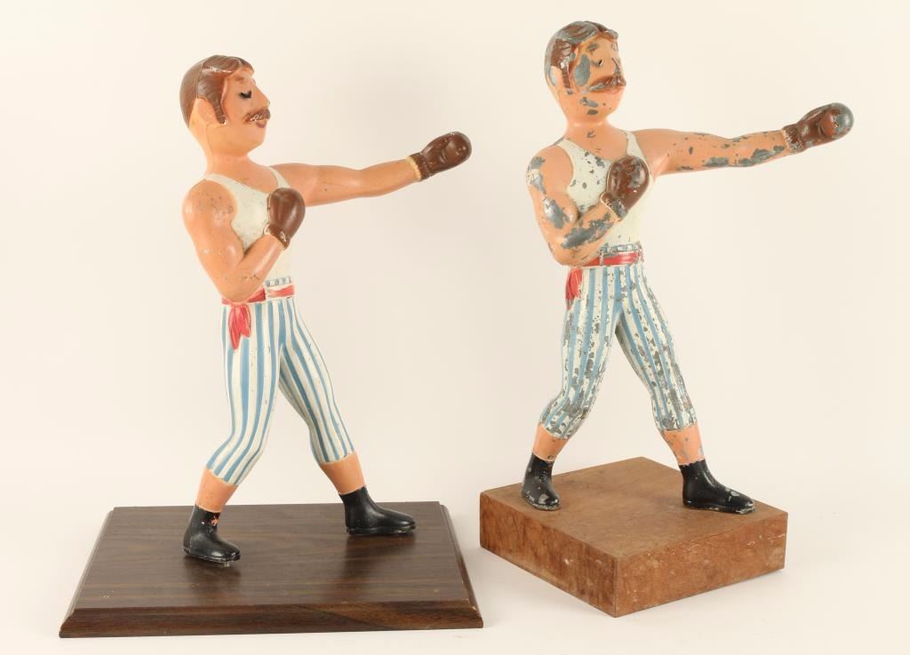 John Sullivan boxers mounted on wood bases which have been replaced. One is in good condition, the other shows scattered losses. Both measure approx. 13"x7"