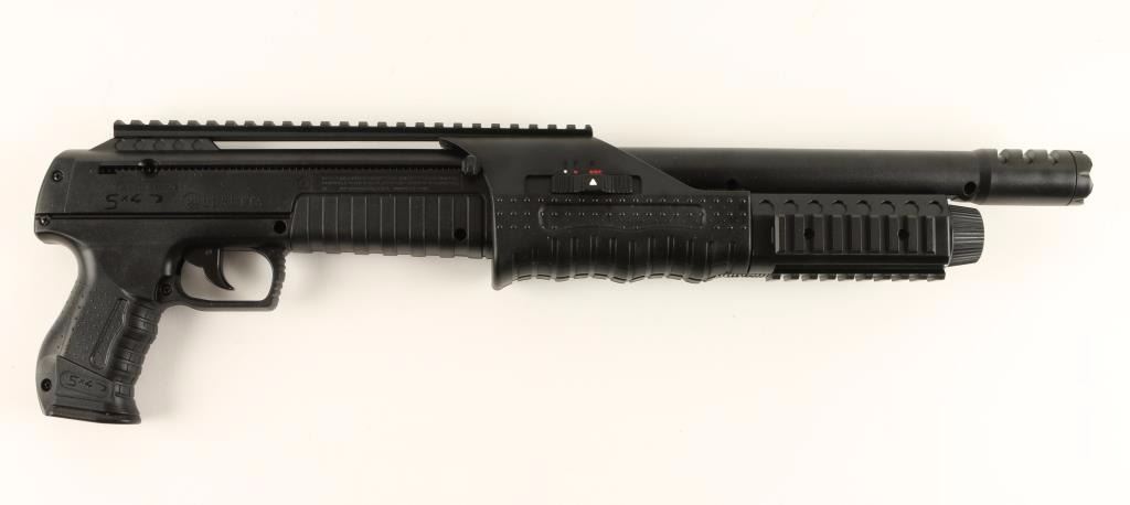 3 shot burst or single shot, black, has the look of a pump shotgun, uses a 88g Co2 cylinder which is not included, takes cal.177,holds 40 rounds, like new in the original box.