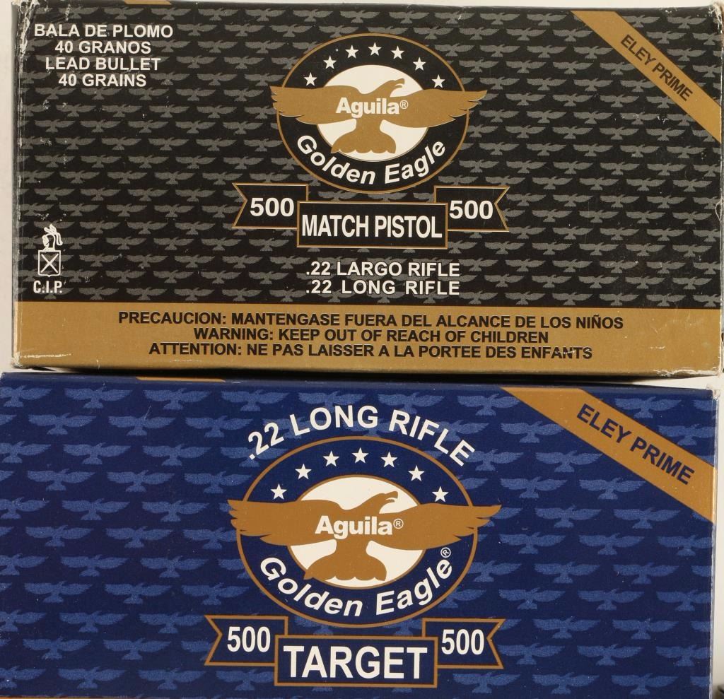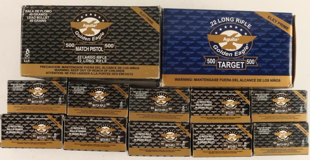 Consisting of one 500 round box of Aguila Golden Eagle Match Pistol 40 grain lead round nose, one partial and nine full 50 round boxes of Aguila Golden Eagle Match Rifle 40 grain lead round nose, and one 500 round box of Aguila Golden Eagle Target Eley primed 40 grain lead round nose ammunition.