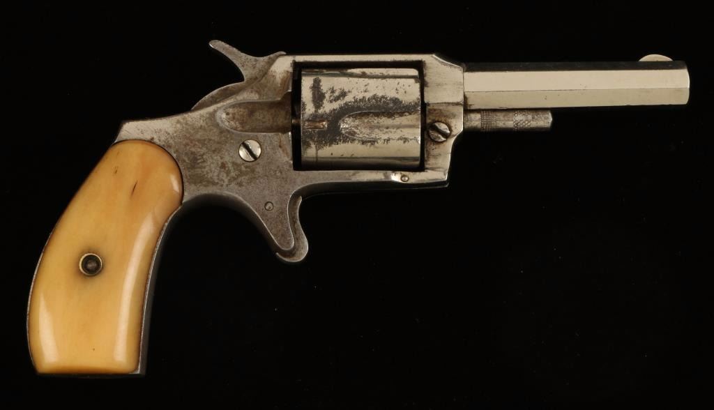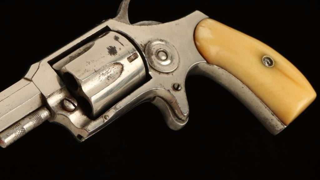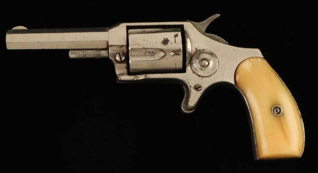 'No. 4' Nickel finished spur trigger small frame revolver chambered in .32 Rimfire. Features a 2.75" octagonal barrel, fixed sights, five shot fluted cylinder, checkered hammer spur and nicely aged bone grips. Finish shows approximately 70% original nickel plating intact with right side of frame having to most wear. Action is tight but does not rotate the cylinder, bore shows strong rifling, and grips are fine. Condition is very good+ as antique. ***Antique Firearm***