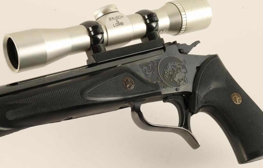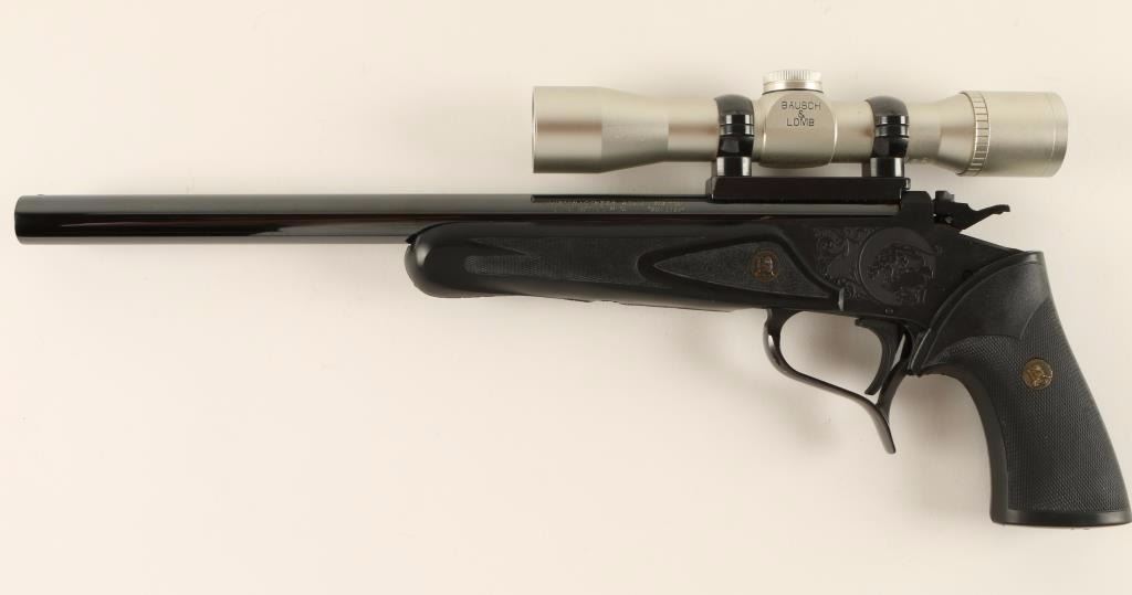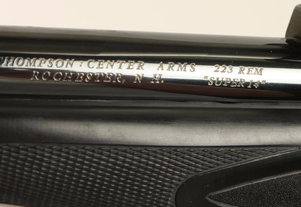 'First Generation' Break-action single shot pistol chambered in .223 Remington. Features a blued finish, 14" heavy "Super 14" barrel with extractor, no sights, Bausch & Lomb scope on Leupold base, engraved frame, serrated trigger, exposed hammer with safety selector, and Pachmayr black checkered rubber pistol grip & schnabeled forend. Pistol retains 95% original finish with few losses. Action is firm, bore is good, and stocks are fine. Condition is very good+. ***Modern Firearm***