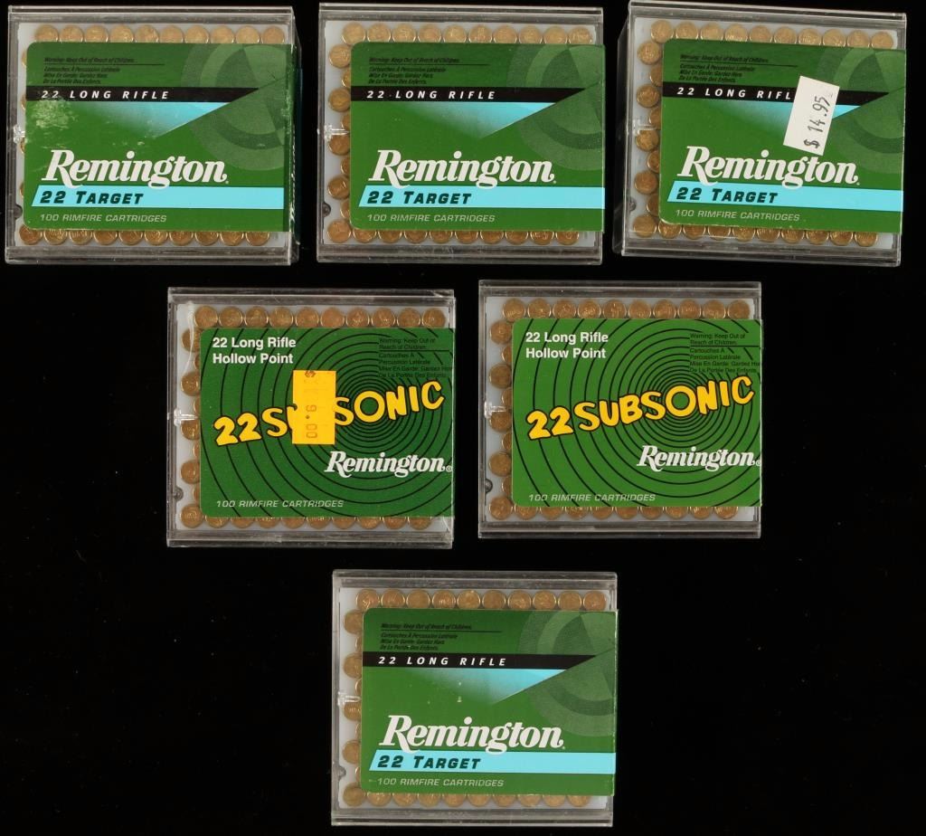 Consisting of two 100 round cases of Remington 22 Subsonic 38 grain lead hollow point, and four 100 round cases of Remington 22 Target 40 grain lead round nose ammunition.