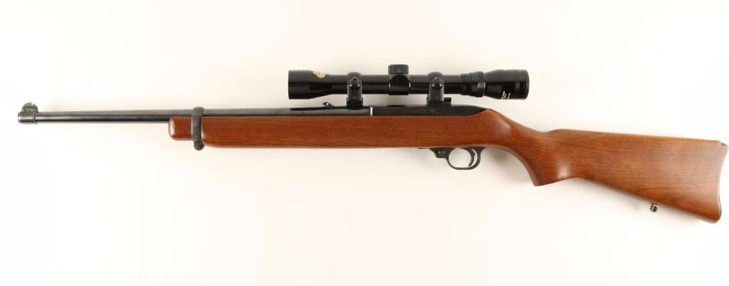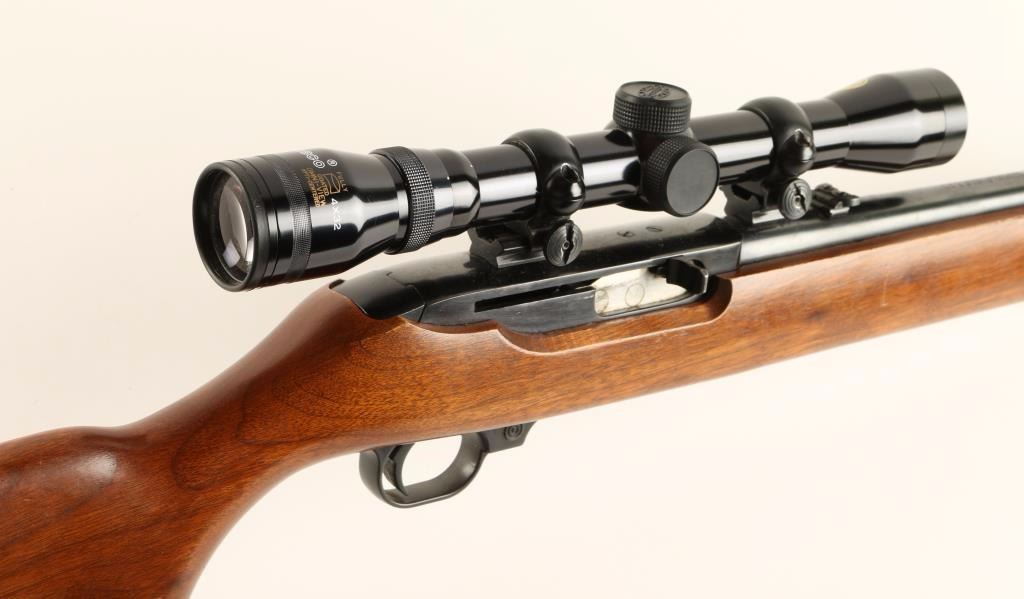 Tube-fed semi automatic rifle chambered in .44 Magnum. Features a blued finish, 18.5" tapered barrel, blade front sight with white insert, adjustable flip-up rear sight, 1/2 tube magazine, push button safety, smooth trigger, Tasco 4x Omni-View scope, swivel stud, and smooth pistol grip wood stock with metal carbine buttplate. Rifle has few areas of minor wear with 93% original finish intact. Action is solid, bore is bright, and wood stock is fine with minimal dings. Condition is very good. ***Modern Firearm***