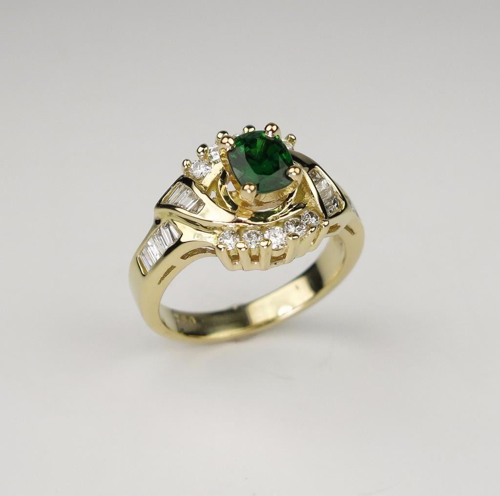 Set with fine Tsavorite garnet weighing 0.80 carats and side fine baguette and round diamonds weighing approx. 0.70 carats of G-H colors and VS clarity set in 18 karat yellow gold.