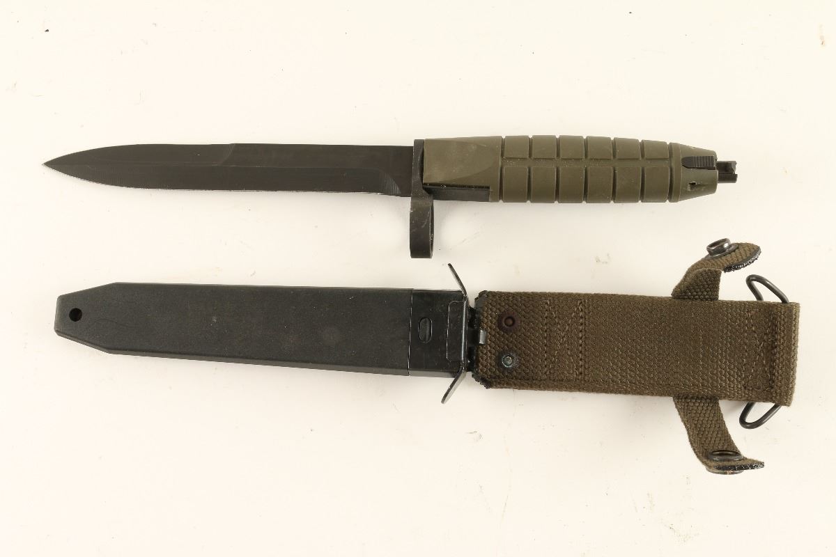 12-1/8" overall length with an 6-5/8" black spear point blade. Handle is green polymer. Scabbard is black polymer with steel throat. Webbing has steel belt hanger and brass strap hardware. May also fit other HK rifles.