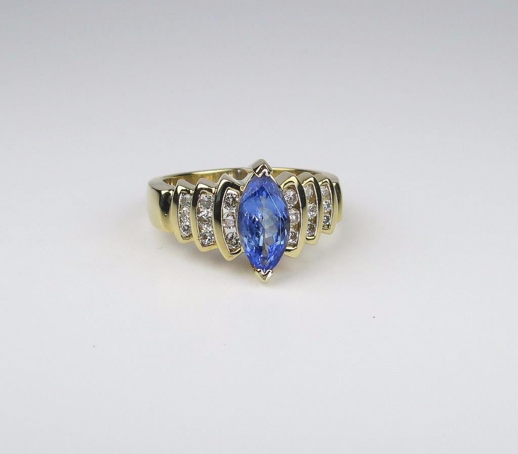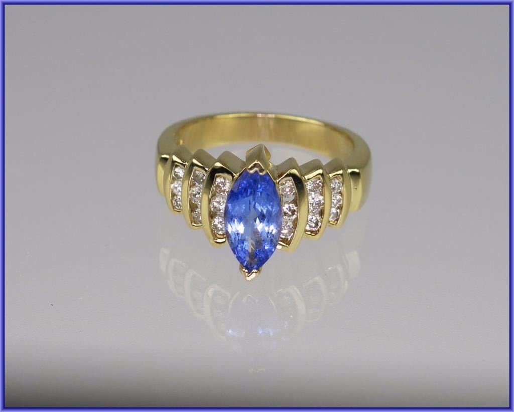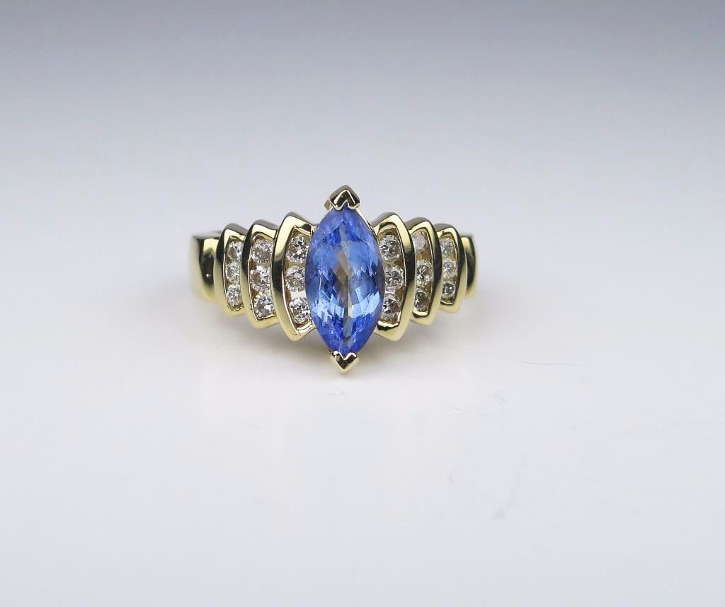 Featuring an approx. 1.50 carat Marquise cut Tanzanite with 18 round channel set diamonds weighing approx. 0.50 carats with H-I colors and VS/SI clarity set in 8.00 grams of 14 karat yellow gold.