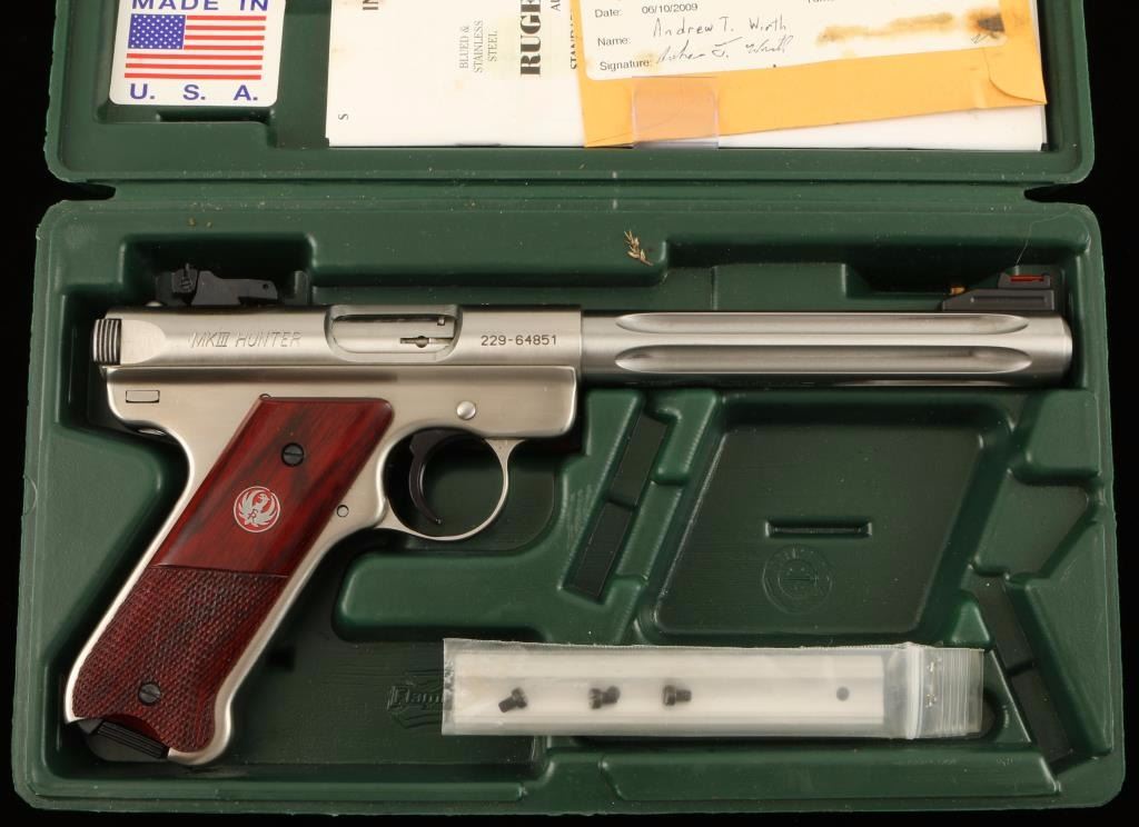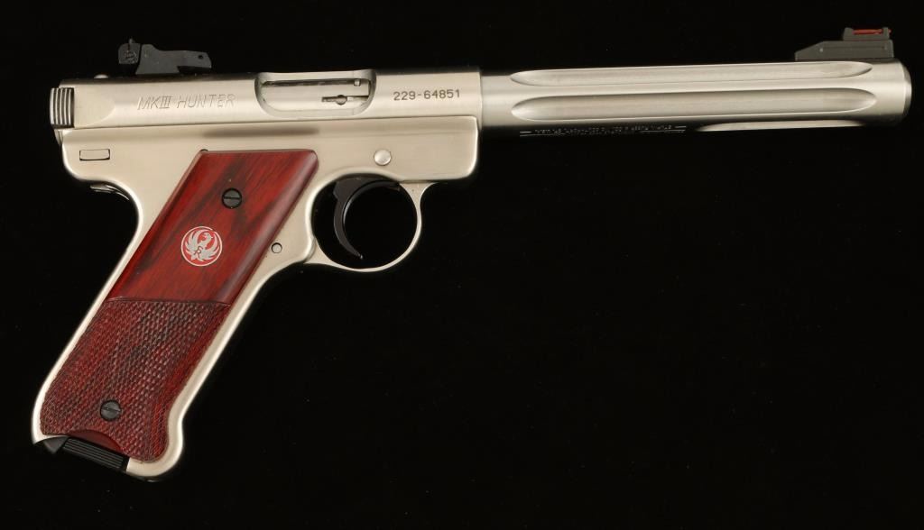 'Mark III Hunter' Stainless steel semi automatic target pistol chambered in .22 Long Rifle. Features a brushed finish, 6 7/8" fluted barrel, HiVis front sight, adjustable rear sight, thumb safety switch, loaded chamber indicator, wide serrated trigger, push button magazine release, 10 round magazine, and Ruger medallion checkered rosewood grips. Includes original factory hard case with documents and scope rail. Finish shows little to no wear. Action is smooth, bore is pristine, and rosewood grips are fine with small blemishes. Condition is excellent in box. ***Modern Firearm***